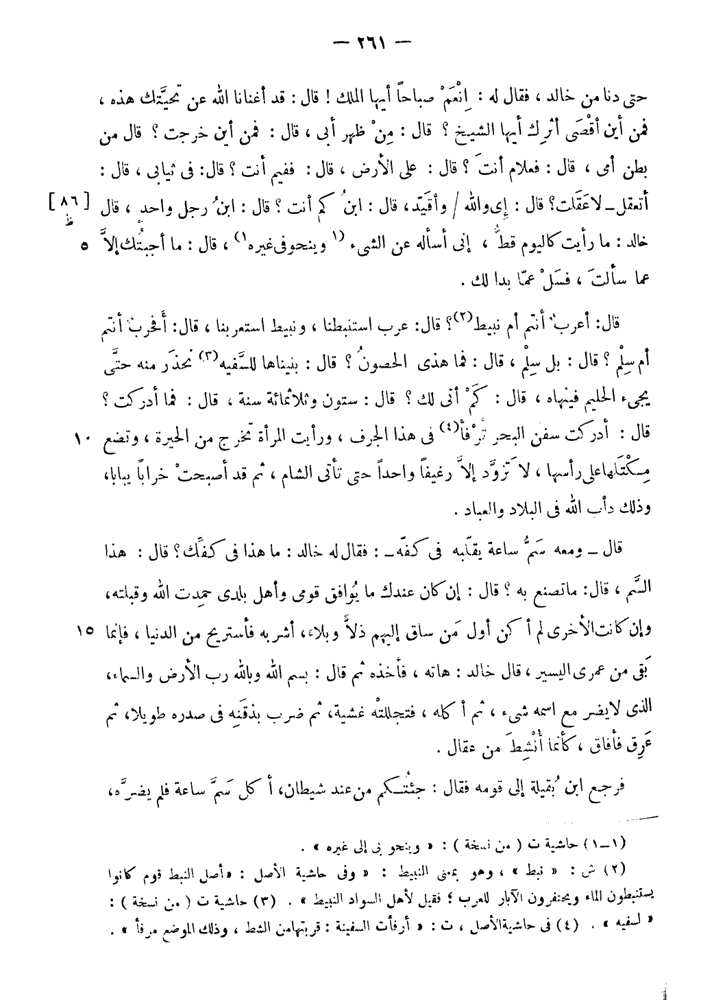 حتى دنا من خالد، فقال له: انعم صباحا أيها الملك! قال: قد أغنانا الله عن تحيّتك هذه، فمن أين أقصى أثرك أيها الشيخ؟ قال: من ظهر أبى، قال: فمن أين خرجت؟ قال من بطن أمى، قال: فعلام أنت؟ قال: على الأرض، قال: ففيم أنت؟ قال: فى ثيابى، قال: