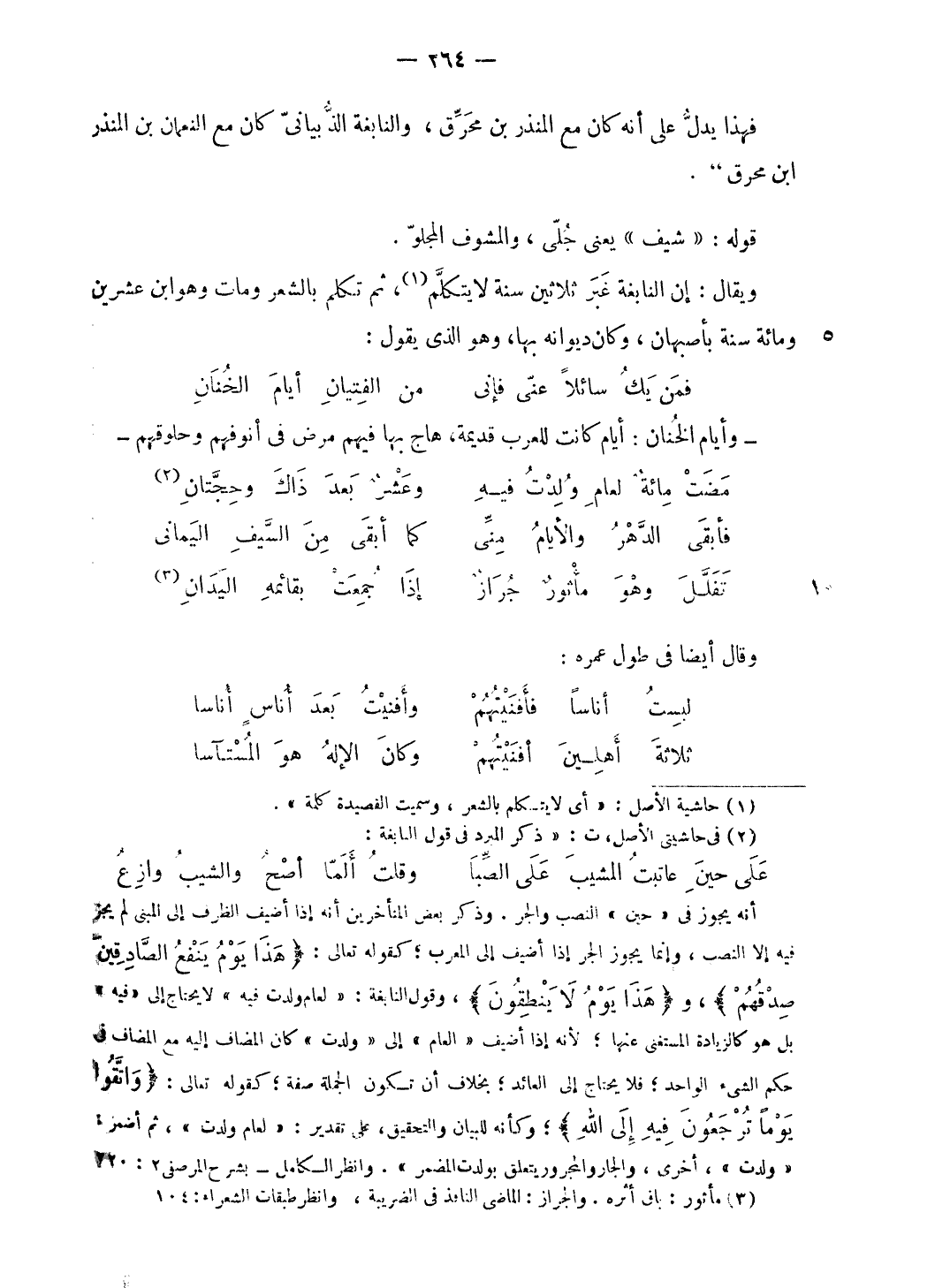 (¬2) فى حاشيتى الأصل، ت: «ذكر المبرد فى قول النابغة: