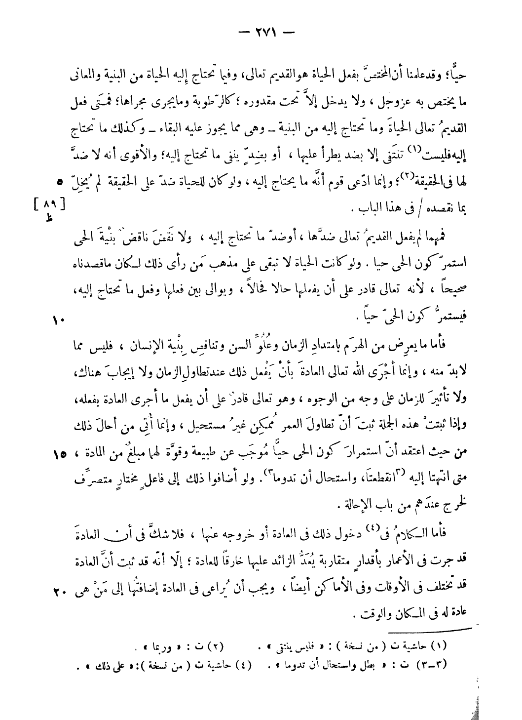 فمهما لم يفعل القديم تعالى ضدّها، أو ضدّ ما تحتاج إليه، ولا نقض ناقض بنية الحى استمرّ كون الحى حيا. ولو كانت الحياة لا تبقى على مذهب من رأى ذلك لكان ما قصدناه صحيحا، لأنه تعالى قادر على أن يفعلها حالا فحالا، ويوالى بين فعلها وفعل ما تحتاج إليه، فيستمرّ كون الحىّ حيا.