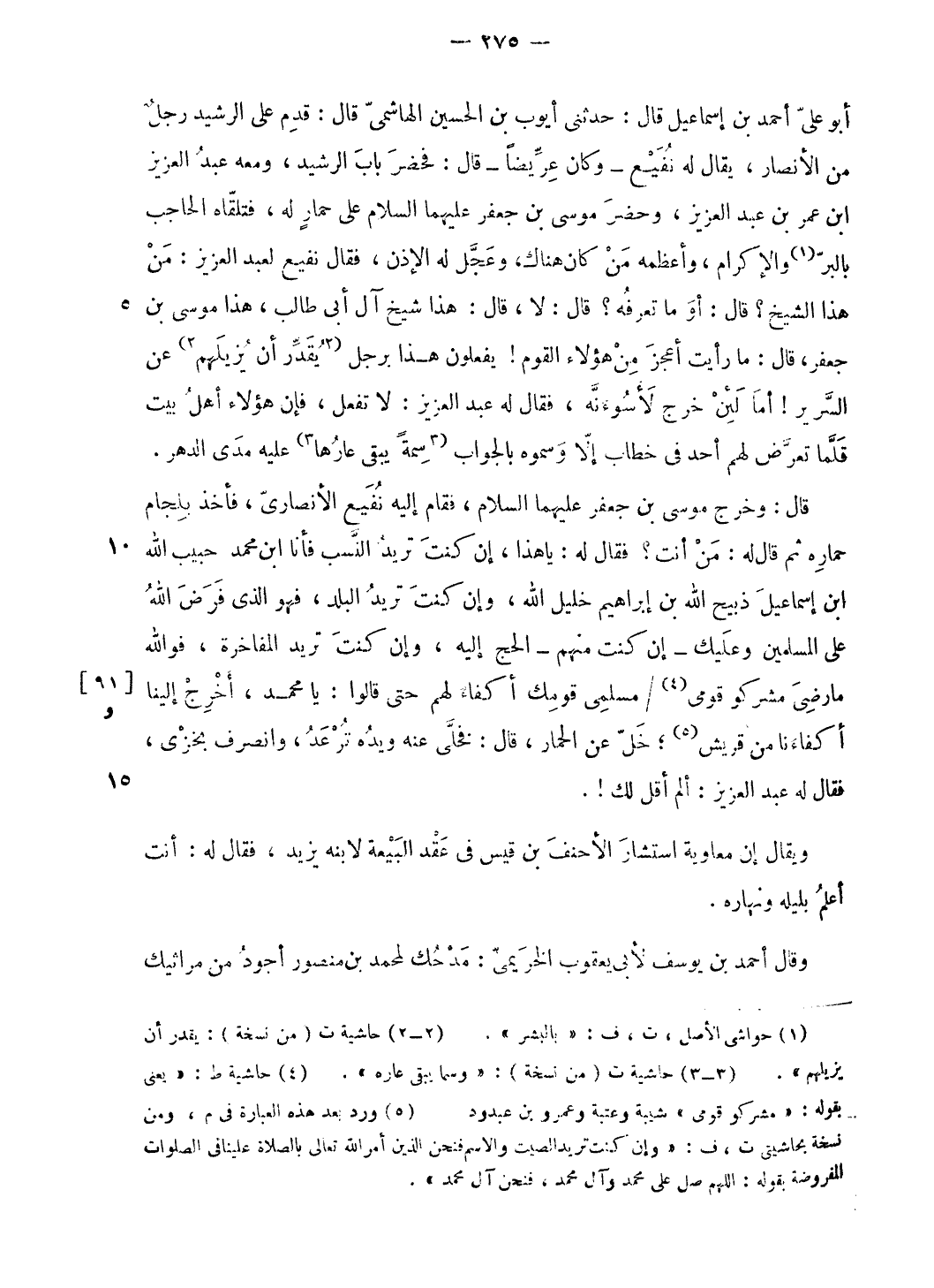 (¬5) ورد بعد هذه العبارة فى م، ومن نسخة بحاشيتى ت، ف: «وإن كنت تريد الصيت والاسم فنحن الذين أمر الله تعالى بالصلاة علينا فى الصلوات المفروضة بقوله: اللهم صل على محمد وآل محمد، فنحن آل محمد».