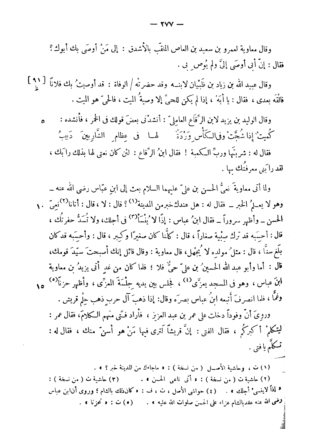 (¬4) حواشى الأصل، ت، ف: «كان ذلك بالشام؛ وروى أن ابن عباس رضى الله عنه عقد بالشام عزاء على الحسن صلوات الله عليه».