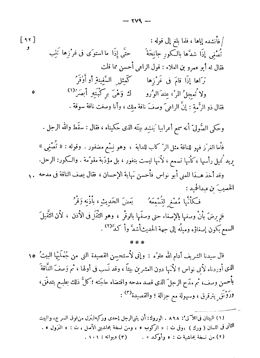 قال سيدنا الشريف أدام الله علوّه: وإنى لأستحسن القصيدة التى من جملتها البيت الّذي أوردناه لأبى نواس؛ لأنها دون العشرين بيتا، وقد نسب فى أولها، ثم وصف النّاقة بأحسن وصف، ثم مدح الرجل الّذي قصد مدحه واقتضاه حاجته؛ كلّ ذلك بطبع يتدفّق، ورونق يترقرق، وسهولة مع جزالة؛ والقصيدة (¬3):