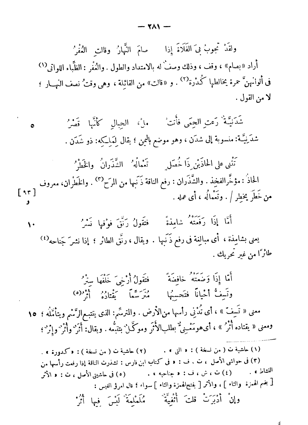 معنى «تسفّ»، أى تدنى رأسها من الأرض. والمترسّم: الّذي يتتبع الرّسم ويتأمّله؛ ومعنى «يقتاده أثر»، أى هو معنى بطلب الأثر وموكّل بتتبّعه. ويقال: أثر وأثر وإثر؛