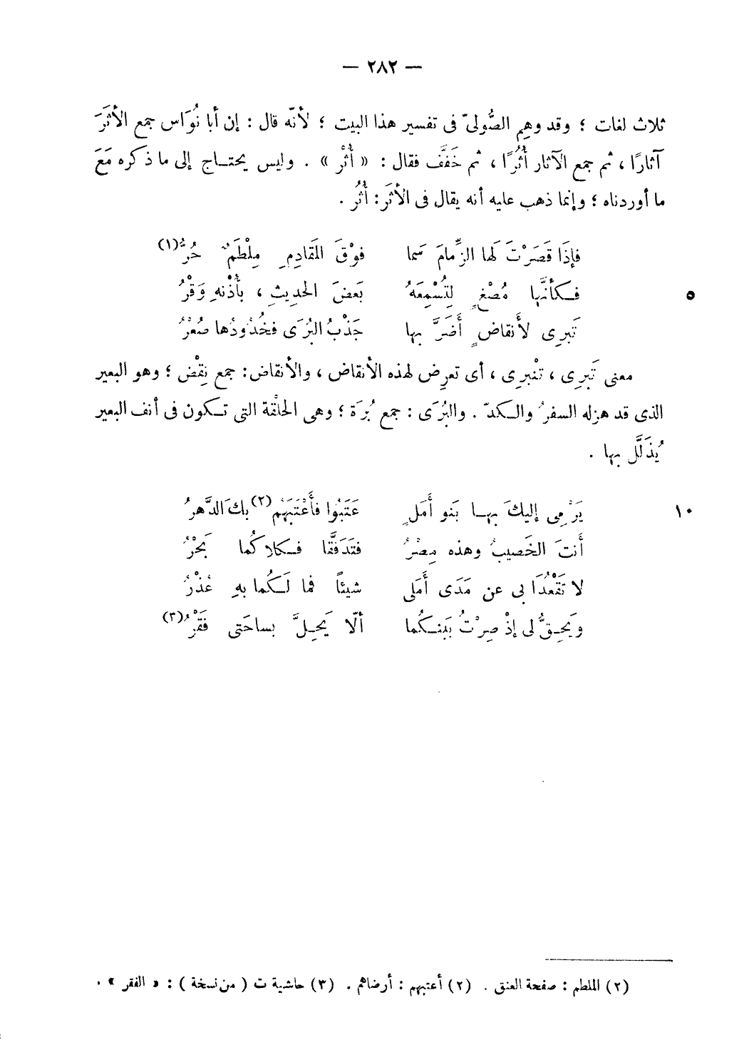 معنى تبرى، تنبرى، أى تعرض لهذه الأنقاض، والأنقاض: جمع نقض؛ وهو البعير الّذي قد هزله السفر والكدّ. والبرى: جمع برة؛ وهى الحلقة التى تكون فى أنف البعير يذلّل بها.