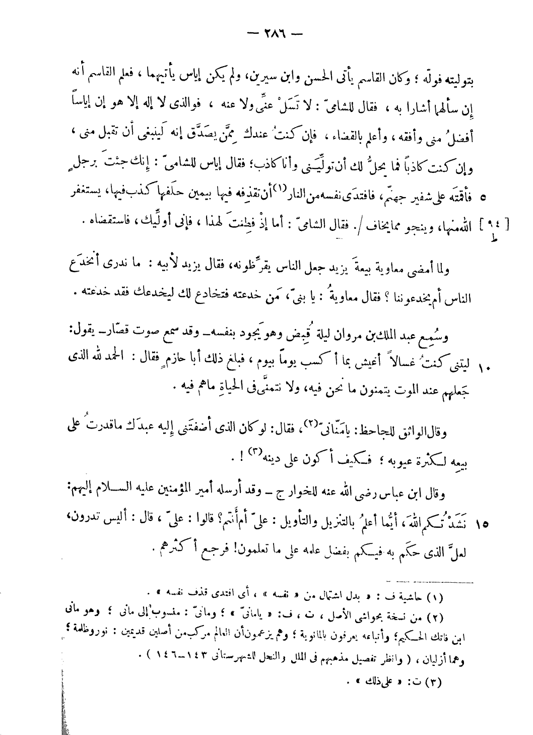 بتوليته فولّه؛ وكان القاسم يأتى الحسن وابن سيرين، ولم يكن إياس يأتيهما، فعلم القاسم أنه إن سألهما أشارا به، فقال للشامىّ: لا تسل عنّى ولا عنه، فو الّذي لا إله إلا هو إن إياسا أفضل منى وأفقه، وأعلم بالقضاء، فإن كنت عندك ممّن يصدّق إنه لينبغى أن تقبل منى، وإن كنت كاذبا فما يحلّ لك أن تولّينى وأنا كاذب؛ فقال إياس للشامىّ: إنك جئت برجل فأقمته على شفير جهنّم، فافتدى نفسه من النار (¬1) أن تقذفه فيها بيمين حلفها كذب فيها، يستغفر الله منها، وينجو مما يخاف/. فقال الشامىّ: أما إذ فطنت لهذا، فإنى أولّيك، فاستقضاه.