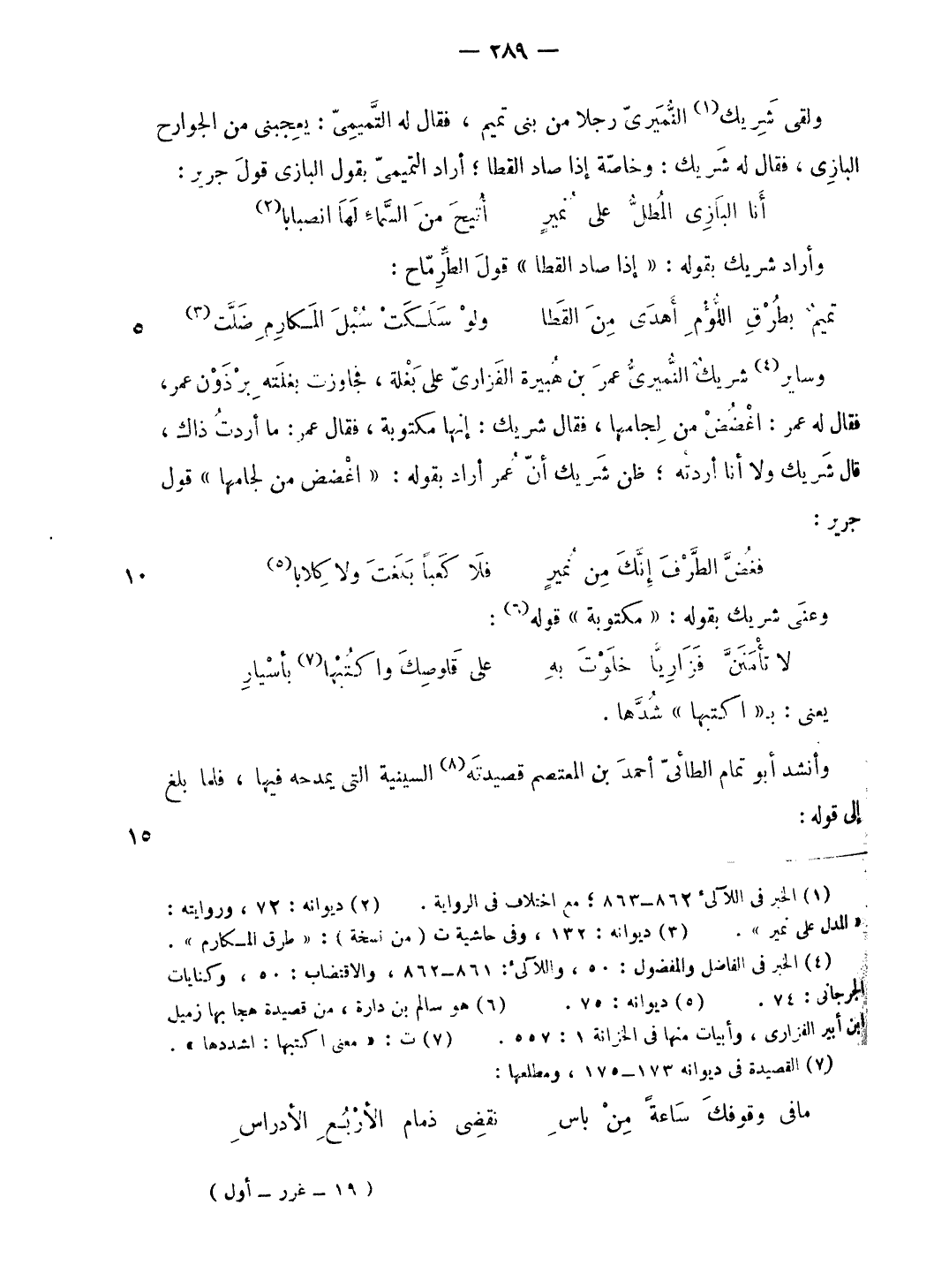 ولقى شريك (¬1) النّميرىّ رجلا من بنى تميم، فقال له التّميمىّ: يعجبنى من الجوارح البازى، فقال له شريك: وخاصّة إذا صاد القطا؛ أراد التميمىّ بقول البازى قول جرير: