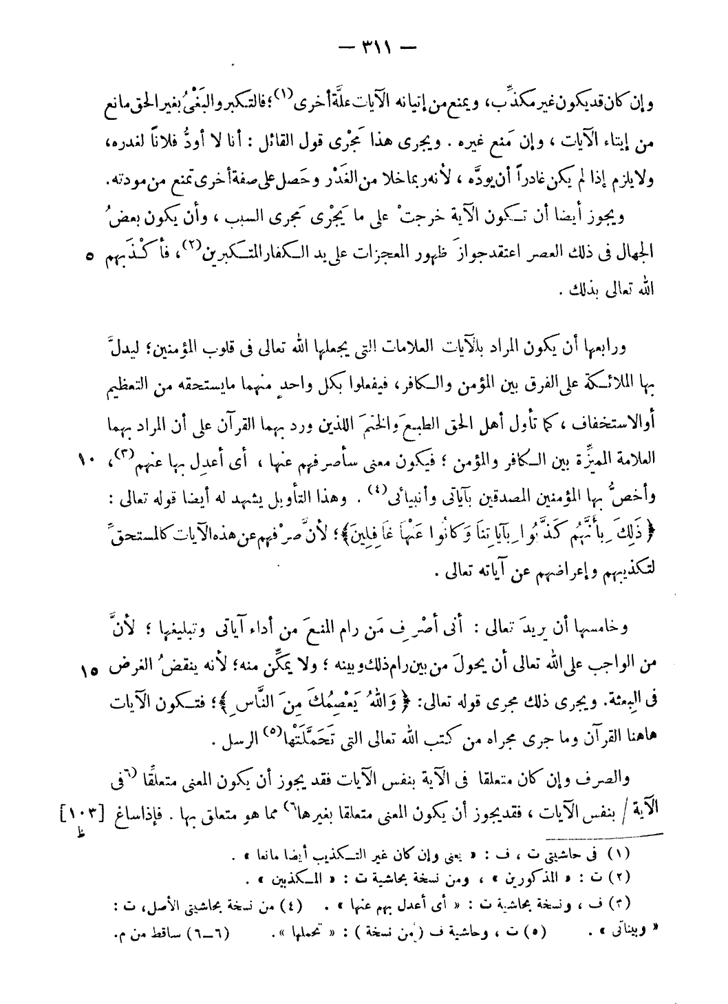 والصرف وإن كان متعلقا فى الآية بنفس الآيات فقد يجوز أن يكون المعنى متعلّقا [فى الآية/ بنفس الآيات، فقد يجوز أن يكون المعنى متعلقا بغيرها] (¬6) مما هو متعلق بها. فإذا ساغ