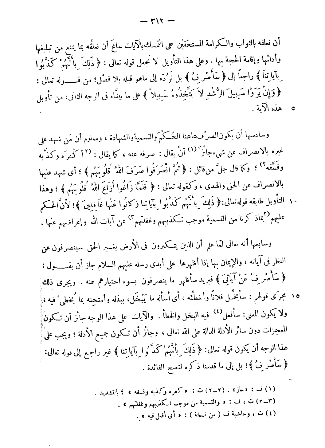 وسادسها أن يكون الصرف هاهنا الحكم والتسمية والشهادة، ومعلوم أن من شهد على غيره بالانصراف عن شيء جائز (¬1) أن يقال: صرفه عنه، كما يقال: [أكفره وكذّبه وفسّقه] (¬2)؛ وكما قال جلّ من قائل: ثُمَّ انْصَرَفُوا صَرَفَ اللَّهُ قُلُوبَهُمْ؛ أى شهد عليها بالانصراف عن الحق والهدى، وكقوله تعالى: فَلَمَّا زاغُوا أَزاغَ اللَّهُ قُلُوبَهُمْ؛ وهذا التأويل طابقه قوله تعالى: ذلِكَ بِأَنَّهُمْ كَذَّبُوا بِآياتِنا وَكانُوا عَنْها غافِلِينَ؛ لأنّ الحكم عليهم [بما ذكرنا من التسمية موجب تكذيبهم وغفلتهم] (¬3) عن آيات الله وإعراضهم عنها.