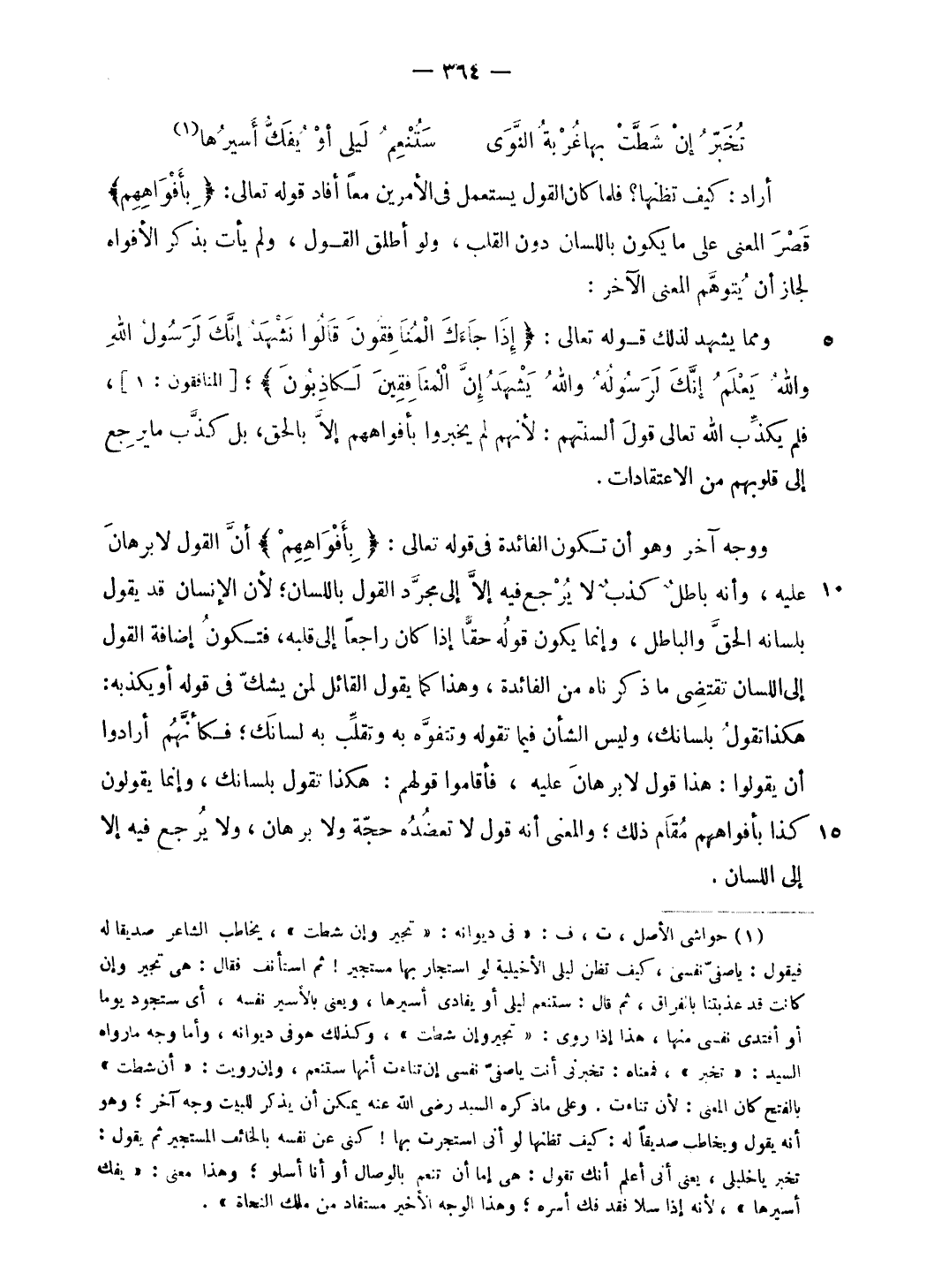 ومما يشهد لذلك قوله تعالى: إِذا جاءَكَ الْمُنافِقُونَ قالُوا نَشْهَدُ إِنَّكَ لَرَسُولُ اللَّهِ وَاللَّهُ يَعْلَمُ إِنَّكَ لَرَسُولُهُ وَاللَّهُ يَشْهَدُ إِنَّ الْمُنافِقِينَ لَكاذِبُونَ؛ [المنافقون: 1]، فلم يكذّب الله تعالى قول ألسنتهم: لأنهم لم يخبروا بأفواههم إلّا بالحق، بل كذّب