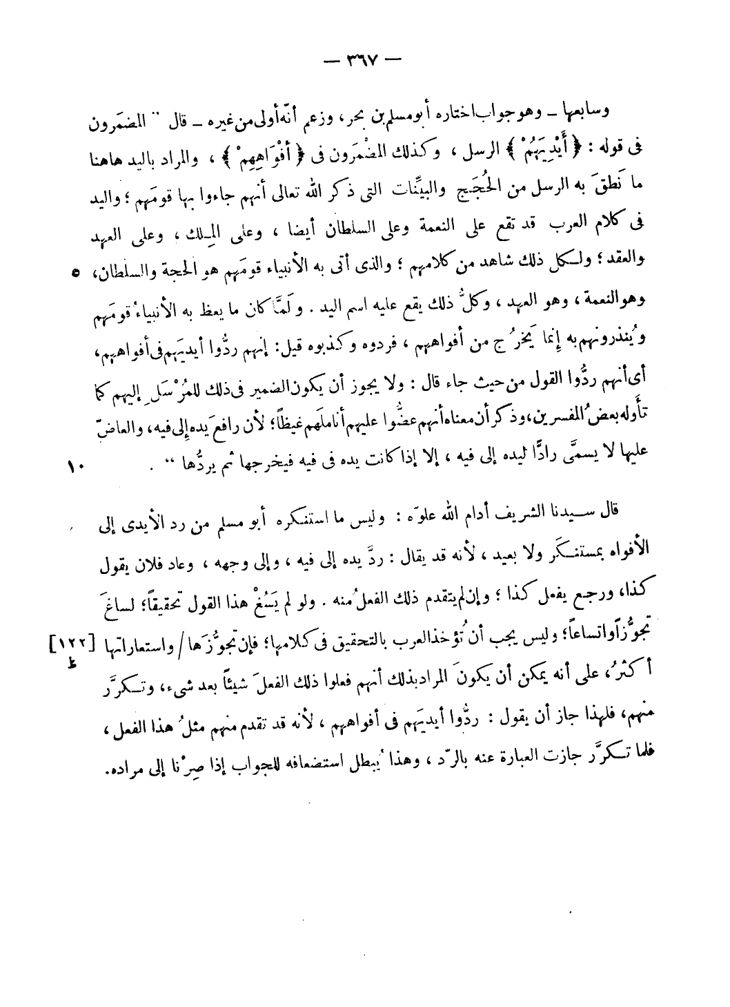 قال سيدنا الشريف أدام الله علوّه: وليس ما استنكره أبو مسلم من رد الأيدى إلى الأفواه بمستنكر ولا بعيد، لأنه قد يقال: ردّ يده إلى فيه، وإلى وجهه، وعاد فلان يقول كذا، ورجع يفعل كذا؛ وإن لم يتقدم ذلك الفعل منه. ولو لم يسغ هذا القول تحقيقا؛ لساغ تجوّزا واتساعا؛ وليس يجب أن تؤخذ العرب بالتحقيق فى كلامها؛ فإن تجوّزها/ واستعاراتها أكثر، على أنه يمكن أن يكون المراد بذلك أنهم فعلوا ذلك الفعل شيئا بعد شيء، وتكرّر منهم، فلهذا جاز أن يقول: ردّوا أيديهم فى أفواههم، لأنه قد تقدم منهم مثل هذا الفعل، فلما تكرّر جازت العبارة عنه بالرّد، وهذا يبطل استضعافه للجواب إذا صرنا إلى مراده.