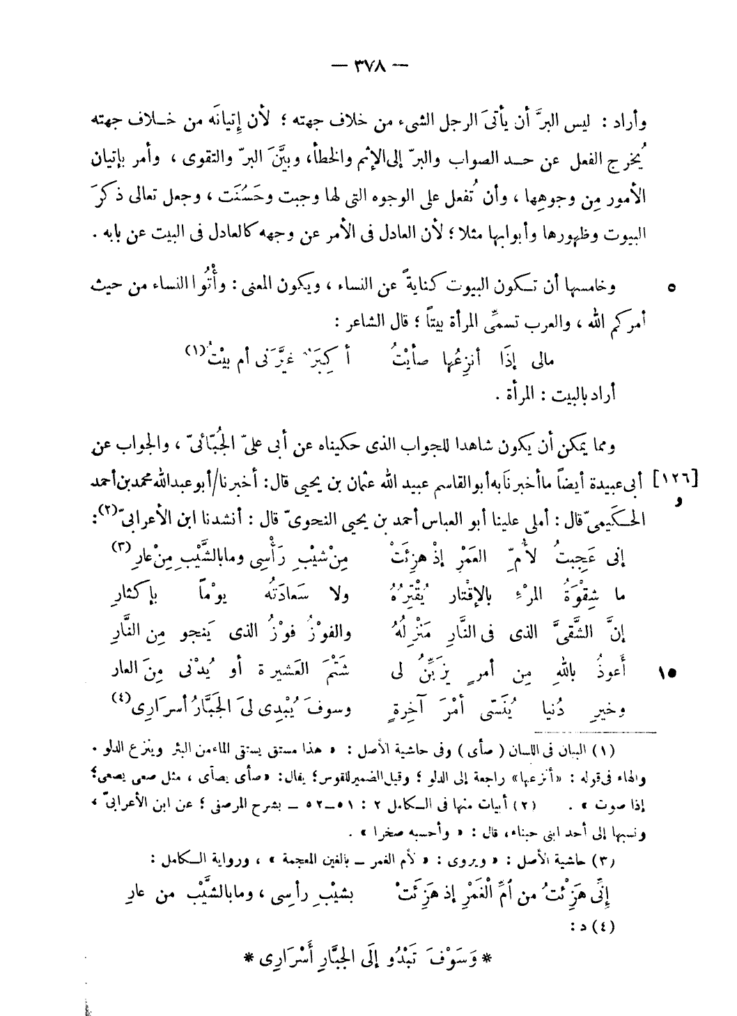 ومما يمكن أن يكون شاهدا للجواب الّذي حكيناه عن أبى عليّ الجبّائىّ، والجواب عن أبى عبيدة أيضا ما أخبرنا به أبو القاسم عبيد الله عثمان بن يحيى قال: أخبرنا/ أبو عبد الله محمد بن أحمد الحكيمىّ قال: أملى علينا أبو العباس أحمد بن يحيى النحوىّ قال: أنشدنا ابن الأعرابىّ (¬2):