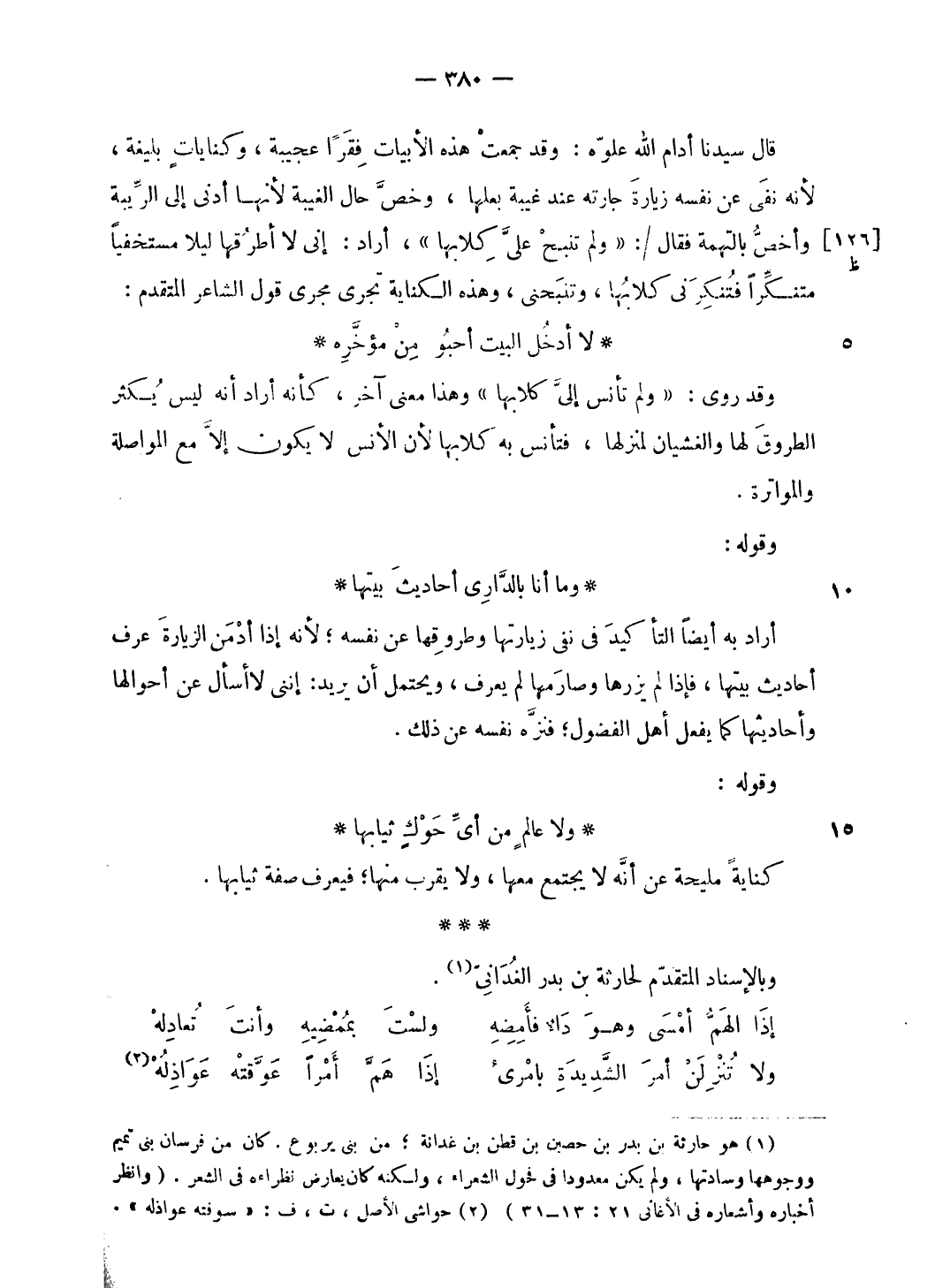 قال سيدنا أدام الله علوّه: وقد جمعت هذه الأبيات فقرا عجيبة، وكنايات بليغة، لأنه نفى عن نفسه زيارة جارته عند غيبة بعلها، وخصّ حال الغيبة لأنها أدنى إلى الرّيبة وأخصّ بالتهمة فقال/: «ولم تنبح عليّ كلابها»، أراد: إنى لا أطرقها ليلا مستخفيا متنكّرا فتنكرنى كلابها، وتنبحنى، وهذه الكناية تجرى مجرى قول الشاعر المتقدم: