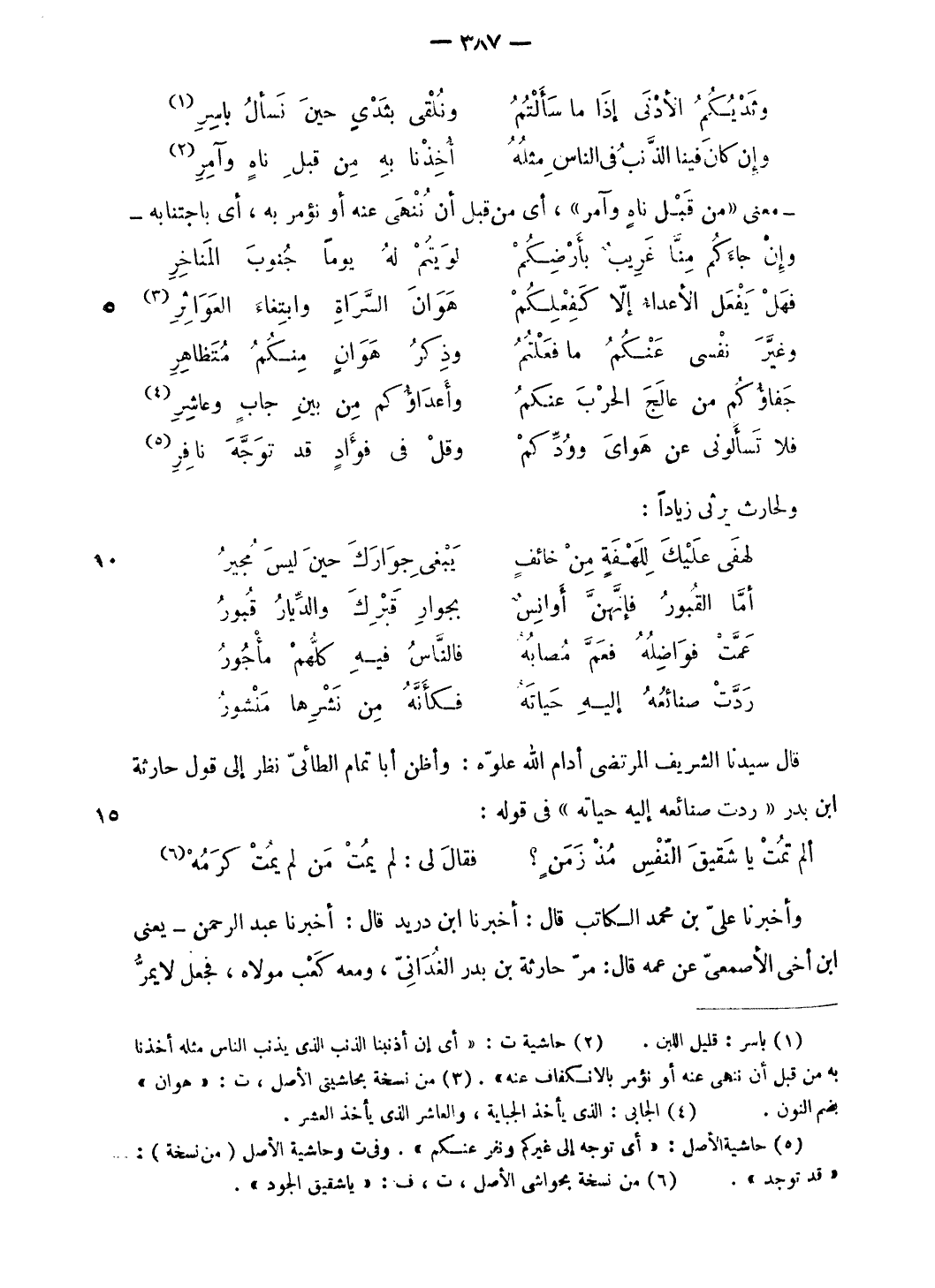 قال سيدنا الشريف المرتضى أدام الله علوّه: وأظن أبا تمام الطائىّ نظر إلى قول حارثة ابن بدر «ردت صنائعه إليه حياته» فى قوله: