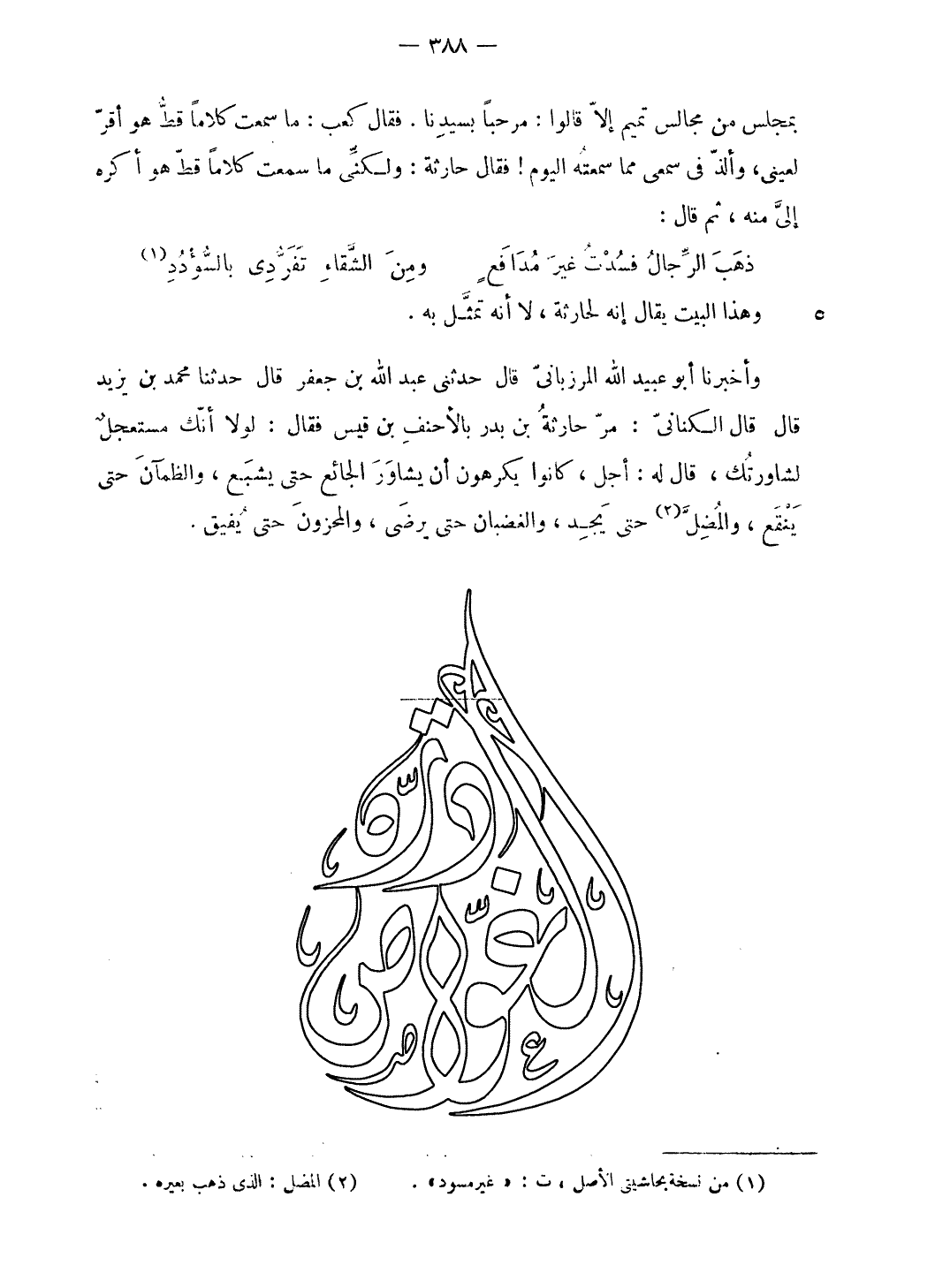 وأخبرنا أبو عبيد الله المرزبانىّ قال حدثنى عبد الله بن جعفر قال حدثنا محمد بن يزيد قال قال الكنانىّ: مرّ حارثة بن بدر بالأحنف بن قيس فقال: لولا أنّك مستعجل لشاورتك، قال له: أجل، كانوا يكرهون أن يشاور الجائع حتى يشبع، والظمآن حتى ينقع، والمضلّ (¬2) حتى يجد، والغضبان حتى يرضى، والمحزون حتى يفيق.