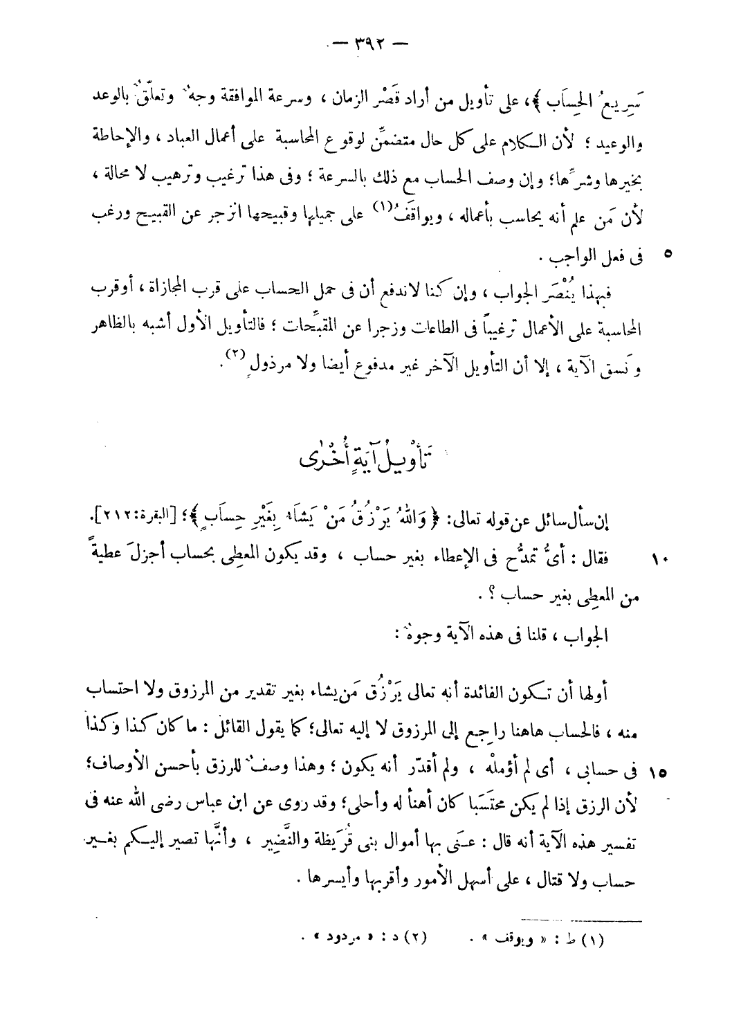 سَرِيعُ الْحِسابِ، على تأويل من أراد قصر الزمان، وسرعة الموافقة وجه وتعلّق بالوعد والوعيد؛ لأن الكلام على كل حال متضمّن لوقوع المحاسبة على أعمال العباد، والإحاطة بخيرها وشرّها؛ وإن وصف الحساب مع ذلك بالسرعة؛ وفى هذا ترغيب وترهيب لا محالة، لأن من علم أنه يحاسب بأعماله، ويواقف (¬1) على جميلها وقبيحها انزجر عن القبيح ورغب فى فعل الواجب.