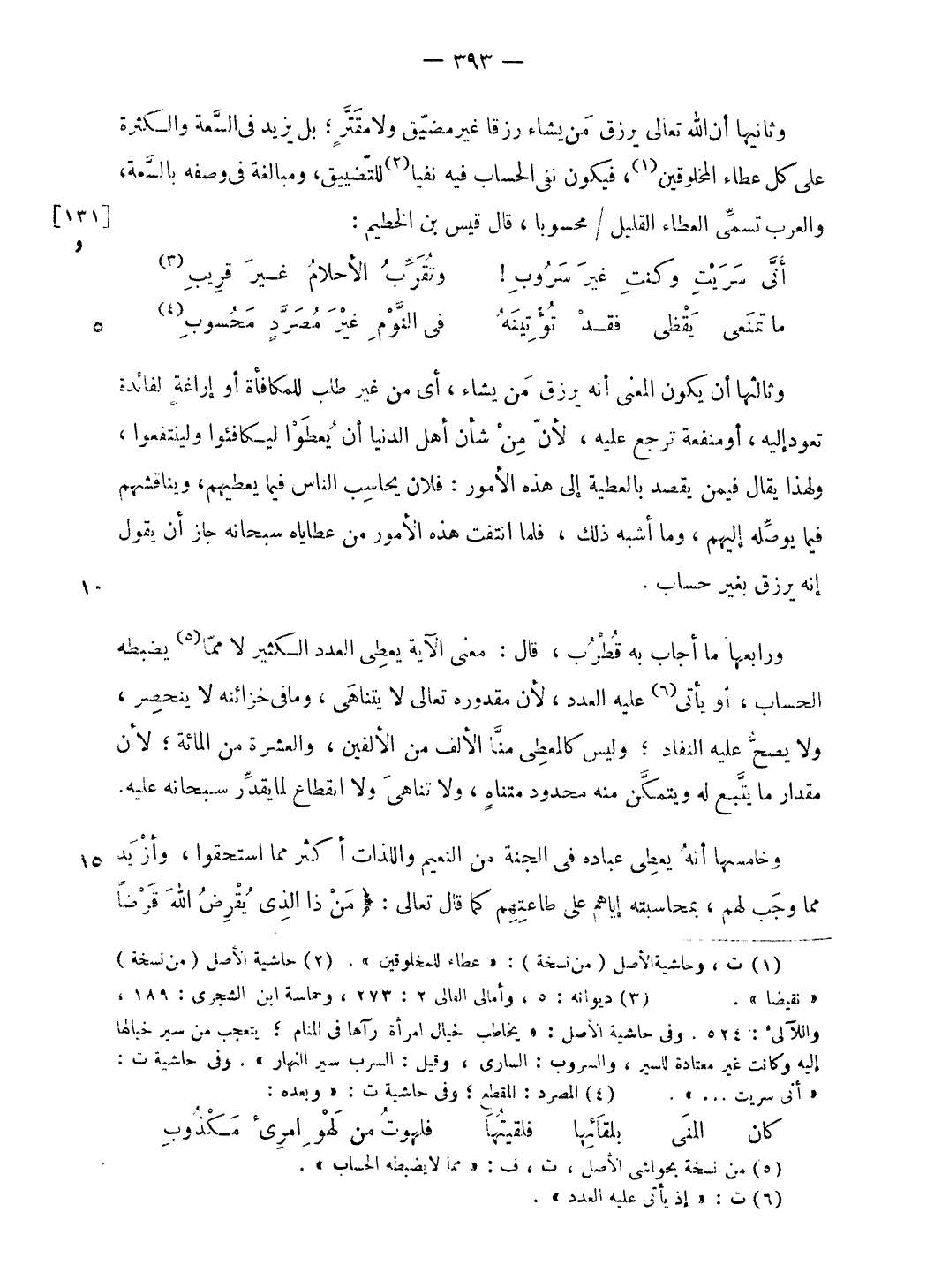 ورابعها ما أجاب به قطرب، قال: معنى الآية يعطى العدد الكثير لا ممّا (¬5) يضبطه الحساب، أو يأتى (¬6) عليه العدد، لأن مقدوره تعالى لا يتناهى، وما فى خزائنه لا ينحصر، ولا يصحّ عليه النفاد؛ وليس كالمعطى منّا الألف من الألفين، والعشرة من المائة؛ لأن مقدار ما يتّبع له ويتمكّن منه محدود متناه، ولا تناهى ولا انقطاع لما يقدّر سبحانه عليه.