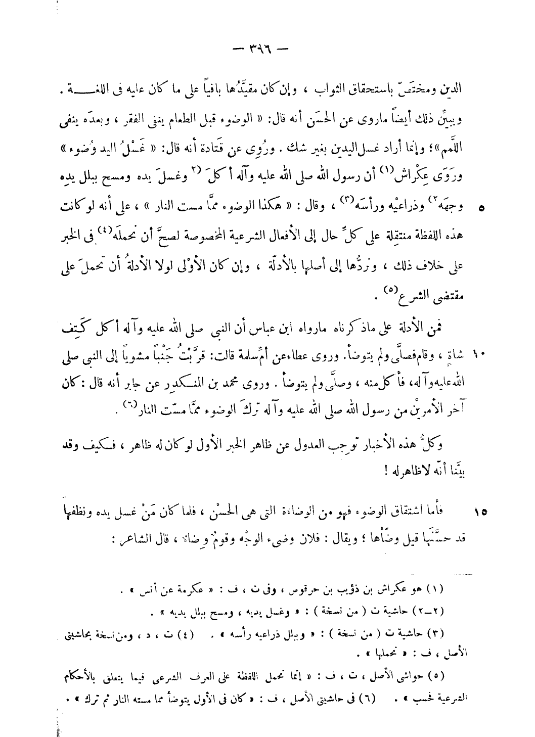ويبيّن ذلك أيضا ما روى عن الحسن أنه قال: «الوضوء قبل الطعام ينفى الفقر، وبعده ينفى اللّمم»؛ وإنما أراد غسل اليدين بغير شك. وروى عن قتادة أنه قال: «غسل اليد وضوء» وروى عكراش (¬1) أن رسول الله صلى الله عليه وآله أكل [وغسل يده ومسح ببلل يده وجهه] (¬2) وذراعيه ورأسه (¬3)، وقال: «هكذا الوضوء ممّا مست النار»، على أنه لو كانت هذه اللفظة منتقلة على كلّ حال إلى الأفعال الشرعية المخصوصة لصحّ أن نحمله (¬4) فى الخبر على خلاف ذلك، ونردّها إلى أصلها بالأدلّة، وإن كان الأولى لولا الأدلة أن تحمل على مقتضى الشرع (¬5).