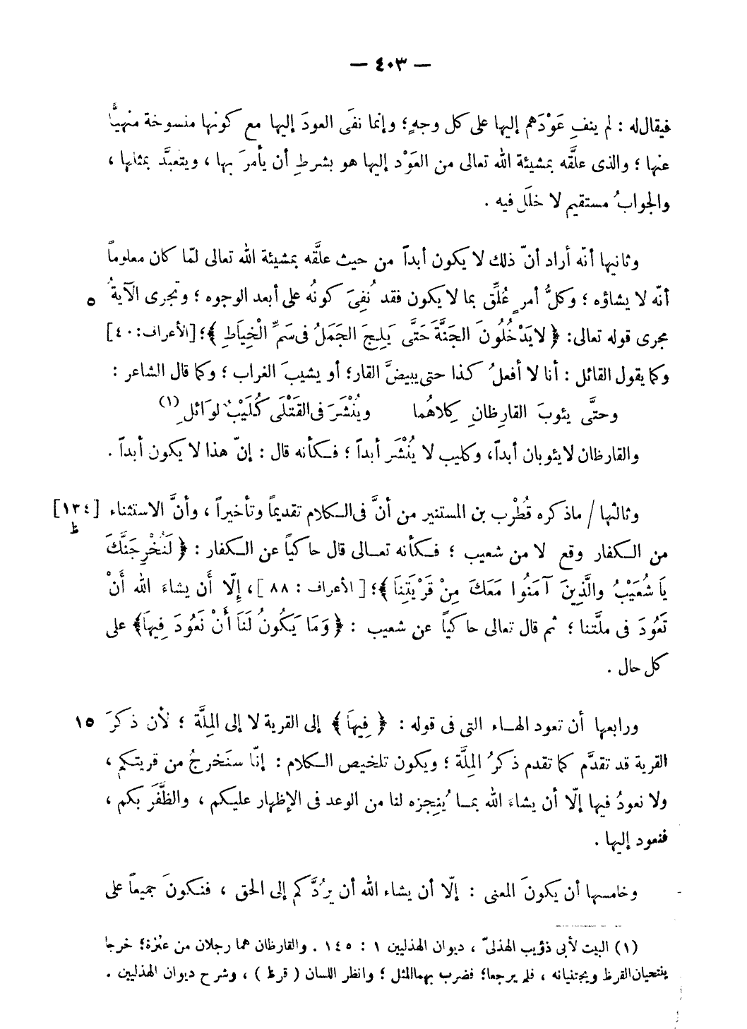ورابعها أن تعود الهاء التى فى قوله: فِيها إلى القرية لا إلى الملّة؛ لأن ذكر القرية قد تقدّم كما تقدم ذكر الملّة؛ ويكون تلخيص الكلام: إنّا سنخرج من قريتكم، ولا نعود فيها إلّا أن يشاء الله بما ينجزه لنا من الوعد فى الإظهار عليكم، والظّفر بكم، فنعود إليها.