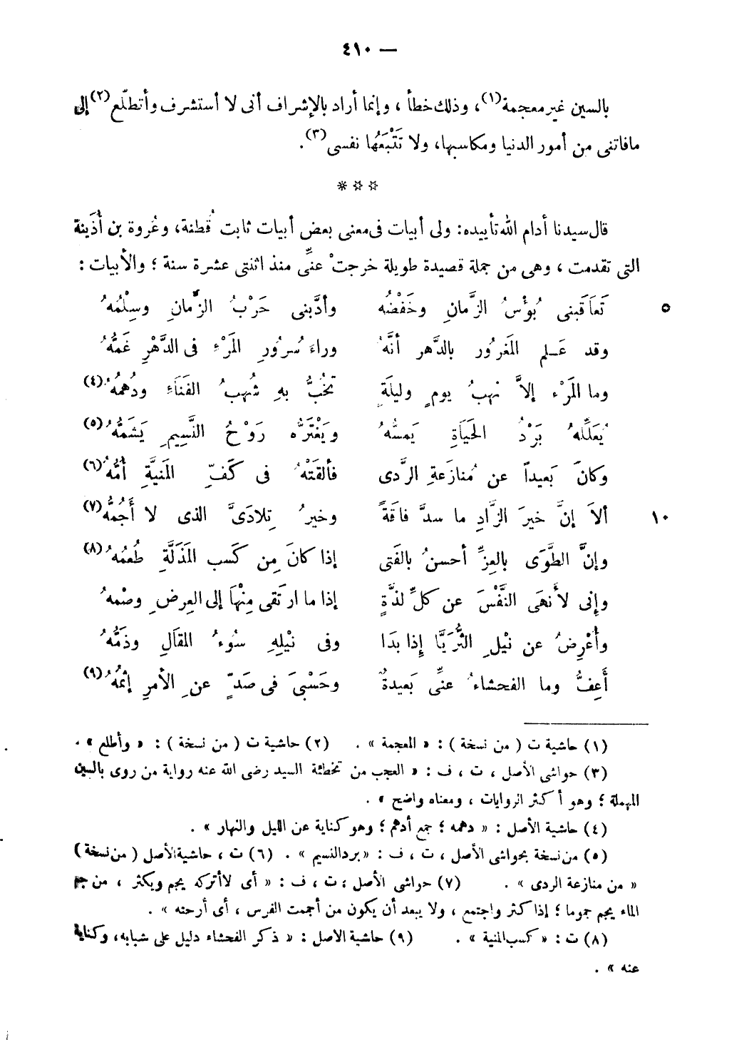قال سيدنا أدام الله تأييده: ولي أبيات فى معنى بعض أبيات ثابت قطنة، وعروة بن أذينة التى تقدمت، وهى من جملة قصيدة طويلة خرجت عنّى منذ اثنتى عشرة سنة؛ والأبيات: