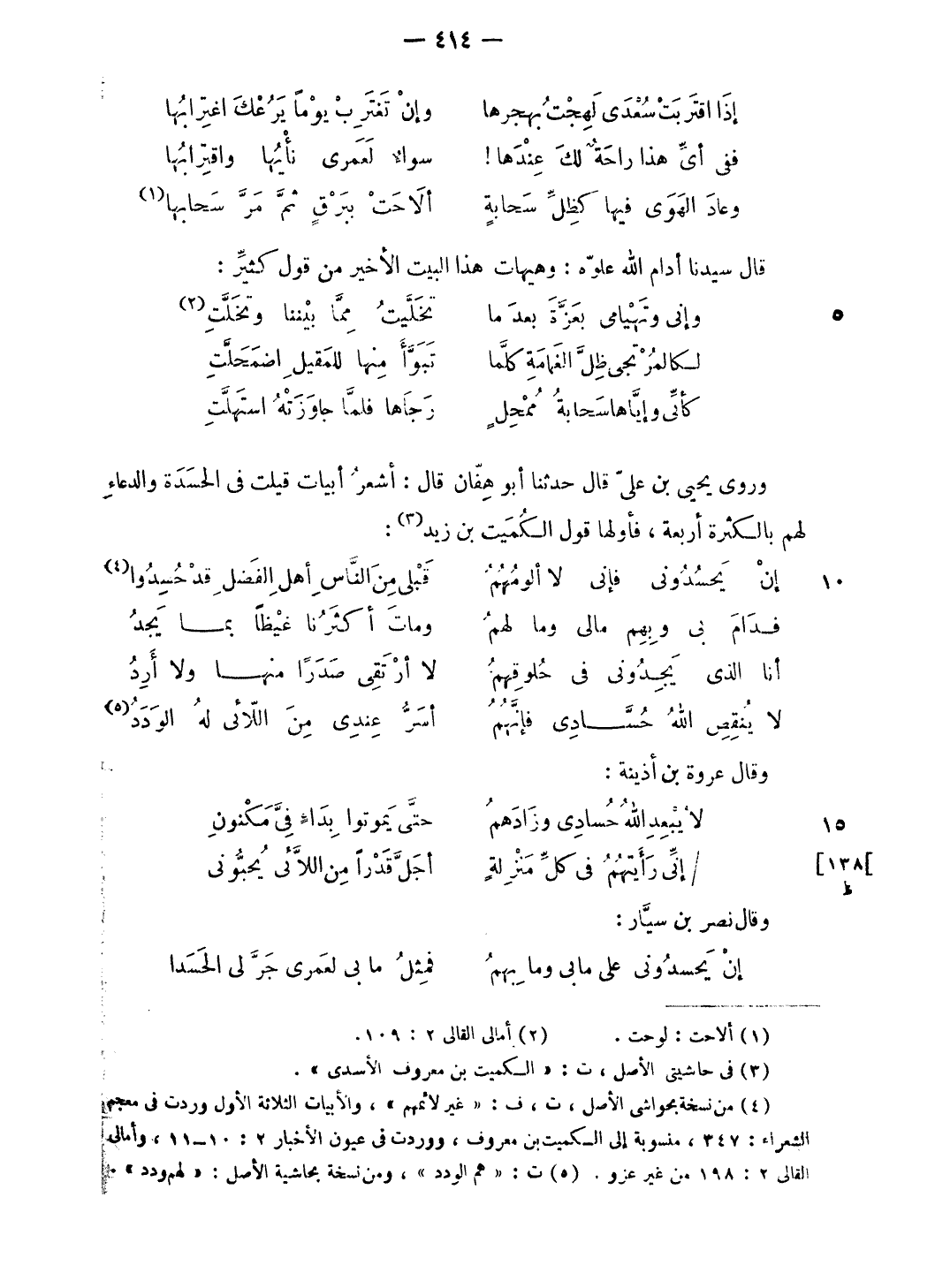 وروى يحيى بن عليّ قال حدثنا أبو هفّان قال: أشعر أبيات قيلت فى الحسدة والدعاء لهم بالكثرة أربعة، فأولها قول الكميت بن زيد (¬3):