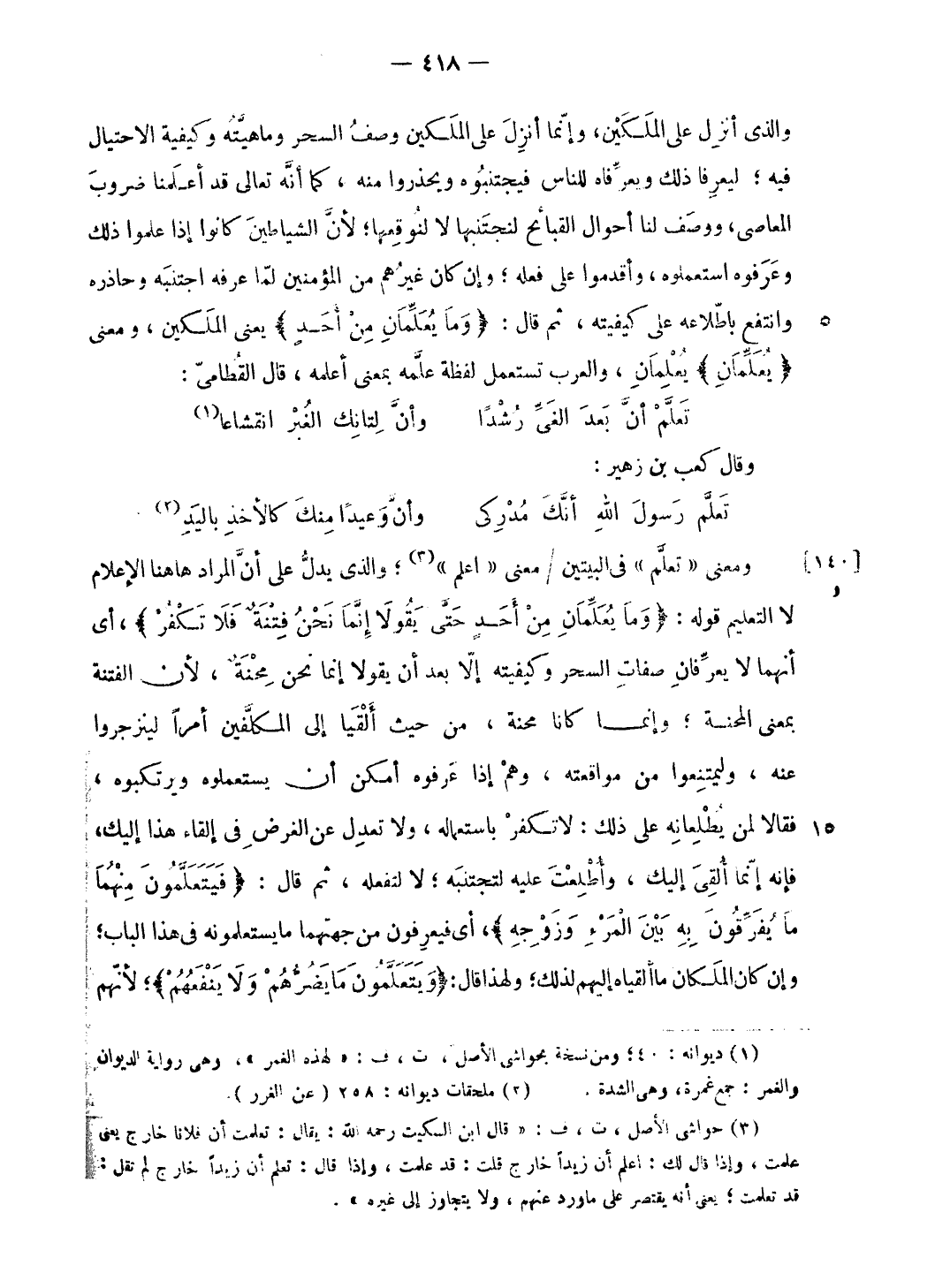 ومعنى «تعلّم» فى البيتين/ معنى «اعلم» (¬3)؛ والّذي يدلّ على أنّ المراد هاهنا الإعلام لا التعليم قوله: وَما يُعَلِّمانِ مِنْ أَحَدٍ حَتَّى يَقُولا إِنَّما نَحْنُ فِتْنَةٌ فَلا تَكْفُرْ، أى أنهما لا يعرّفان صفات السحر وكيفيته إلّا بعد أن يقولا إنما نحن محنة، لأن الفتنة بمعنى المحنة؛ وإنما كانا محنة، من حيث ألقيا إلى المكلّفين أمرا لينزجروا عنه، وليمتنعوا من مواقعته، وهم إذا عرفوه أمكن أن يستعملوه ويرتكبوه، فقالا لمن يطلعانه على ذلك: لا تكفر باستعماله، ولا تعدل عن الغرض فى إلقاء هذا إليك، فإنه إنّما ألقى إليك، وأطلعت عليه لتجتنبه؛ لا لتفعله، ثم قال: فَيَتَعَلَّمُونَ مِنْهُما ما يُفَرِّقُونَ بِهِ بَيْنَ الْمَرْءِ وَزَوْجِهِ، أى فيعرفون من جهتهما ما يستعلمونه فى هذا الباب؛ وإن كان الملكان ما ألقياه إليهم لذلك؛ ولهذا قال: وَيَتَعَلَّمُونَ ما يَضُرُّهُمْ وَلا يَنْفَعُهُمْ؛ لأنّهم