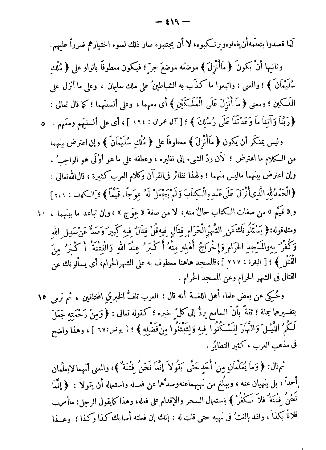 وليس بمنكر أن يكون ما أُنْزِلَ معطوفا على مُلْكِ سُلَيْمانَ وإن اعترض بينهما من الكلام ما اعترض؛ لأن ردّ الشيء إلى نظيره، وعطفه على ما هو أولى هو الواجب، وإن اعترض بينهما ما ليس منهما؛ ولهذا نظائر فى القرآن وكلام العرب كثيرة، قال الله تعالى: