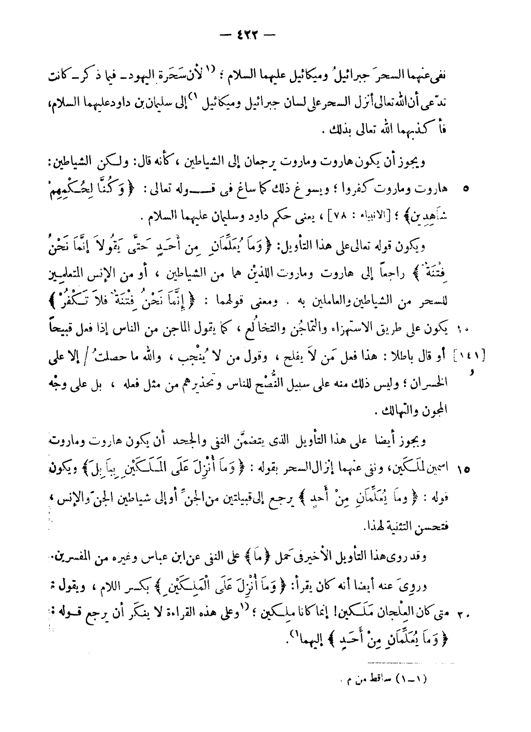 ويجوز أيضا على هذا التأويل الّذي يتضمّن النفى والجحد أن يكون هاروت وماروت اسمين لملكين، ونفى عنهما إنزال السحر بقوله: وَما أُنْزِلَ عَلَى الْمَلَكَيْنِ بِبابِلَ ويكون قوله: وَما يُعَلِّمانِ مِنْ أَحَدٍ يرجع إلى قبيلتين من الجنّ أو إلى شياطين الجنّ والإنس، فتحسن التثنية لهذا.