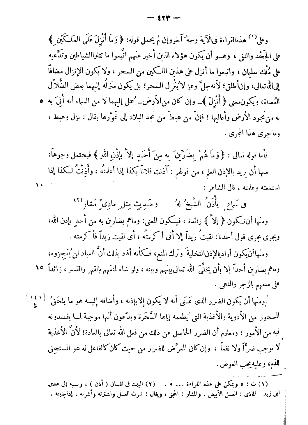 / ومنها أن يكون الضرر الّذي عنى أنه لا يكون إلا بإذنه، وأضافه إليه هو ما يلحق المسحور من الأدوية والأغذية التى يطعمه إياها السّحرة ويدّعون أنها موجبة لما يقصدونه فيه من الأمور؛ ومعلوم أن الضرر الحاصل عن ذلك من فعل الله تعالى بالعادة؛ لأنّ الأغذية لا توجب ضرّا ولا نفعا، وإن كان المعرّض للضرر من حيث كان كالفاعل له هو المستحق للذم، وعليه يجب العوض.