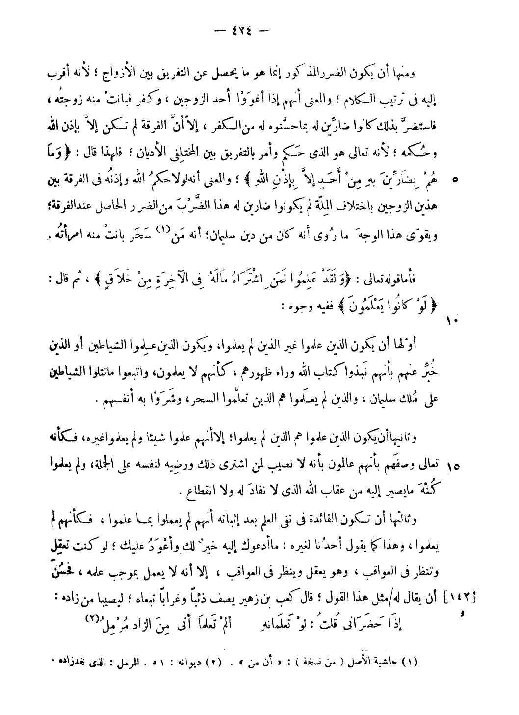 ومنها أن يكون الضرر المذكور إنما هو ما يحصل عن التفريق بين الأزواج؛ لأنه أقرب إليه فى ترتيب الكلام؛ والمعنى أنهم إذا أغووا أحد الزوجين، وكفر فبانت منه زوجته، فاستضرّ بذلك كانوا ضارّين له بما حسّنوه له من الكفر، إلّا أنّ الفرقة لم تكن إلّا بإذن الله وحكمه؛ لأنه تعالى هو الّذي حكم وأمر بالتفريق بين المختلفى الأديان؛ فلهذا قال: وَما هُمْ بِضارِّينَ بِهِ مِنْ أَحَدٍ إِلَّا بِإِذْنِ اللَّهِ؛ والمعنى أنه لولا حكم الله وإذنه فى الفرقة بين هذين الزوجين باختلاف الملّة لم يكونوا ضارين له هذا الضّرب من الضرر الحاصل عند الفرقة؛ ويقوّى هذا الوجه ما روى أنه