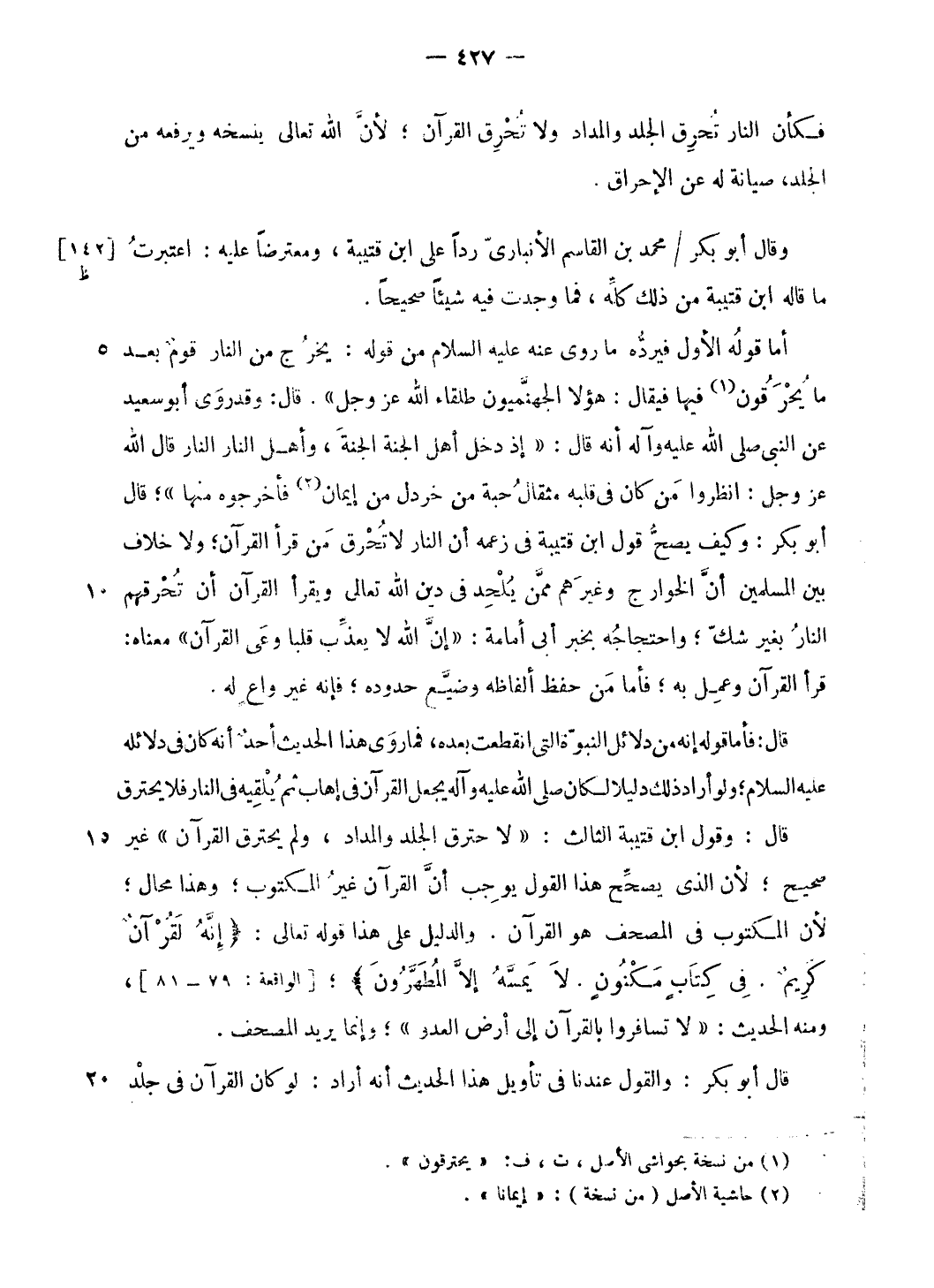 قال: فأما قوله إنه من دلائل النبوّة التى انقطعت بعده، فما روى هذا الحديث أحد أنه كان فى دلائله عليه السلام؛ ولو أراد ذلك دليلا لكان صلى الله عليه وآله يجعل القرآن فى إهاب ثم يلقيه فى النار فلا يحترق قال: وقول ابن قتيبة الثالث: «لاحترق الجلد والمداد، ولم يحترق القرآن» غير صحيح؛ لأن الّذي يصحّح هذا القول يوجب أنّ القرآن غير المكتوب؛ وهذا محال؛ لأن المكتوب فى المصحف هو القرآن. والدليل على هذا قوله تعالى: إِنَّهُ لَقُرْآنٌ كَرِيمٌ. فِي كِتابٍ مَكْنُونٍ. لا يَمَسُّهُ إِلَّا الْمُطَهَّرُونَ؛ [الواقعة: 77 - 79]، ومنه الحديث: «لا تسافروا بالقرآن إلى أرض العدو»؛ وإنما يريد المصحف.