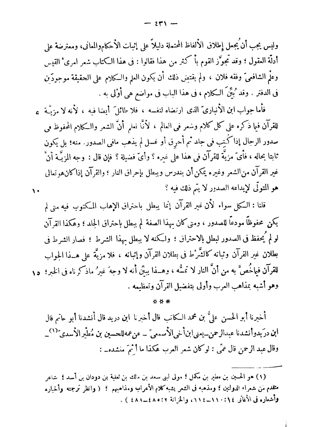 فأما جواب ابن الأنبارىّ الّذي ارتضاه لنفسه، فلا طائل أيضا فيه، لأنه لا مزيّة للقرآن فيما ذكره على كل كلام وشعر فى العالم، لأنّا نعلم أنّ الشعر والكلام المحفوظ فى صدور الرجال إذا كتب فى جلد ثم أحرق أو غسل لم يذهب ما فى الصدور. منه؛ بل يكون ثابتا بحاله، فأىّ مزيّة للقرآن فى هذا على غيره؟ وأىّ فضيلة؟ فإن قال: وجه المزيّة أنّ غير القرآن من الشعر وغيره يمكن أن يندرس ويبطل بإحراق النار؛ والقرآن إذا كان هو تعالى هو المتولّى لإيداعه الصدور لا يتم ذلك فيه؟