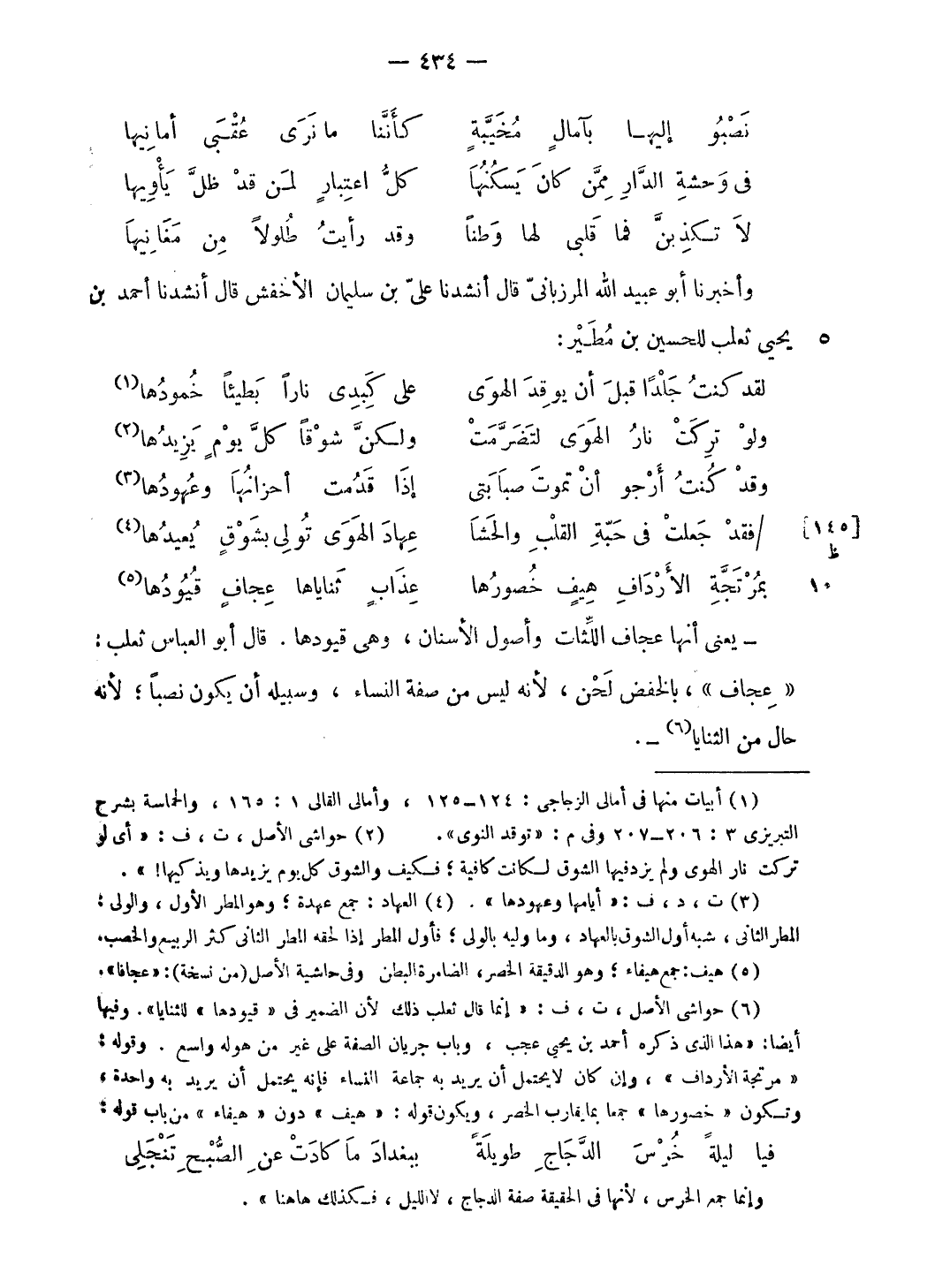 (¬6) حواشى الأصل، ت، ف: «إنما قال ثعلب ذلك لأن الضمير فى «قيودها» للثنايا». وفيها أيضا: «هذا الّذي ذكره أحمد بن يحيى عجب، وباب جريان الصفة على غير من هوله واسع. وقوله: