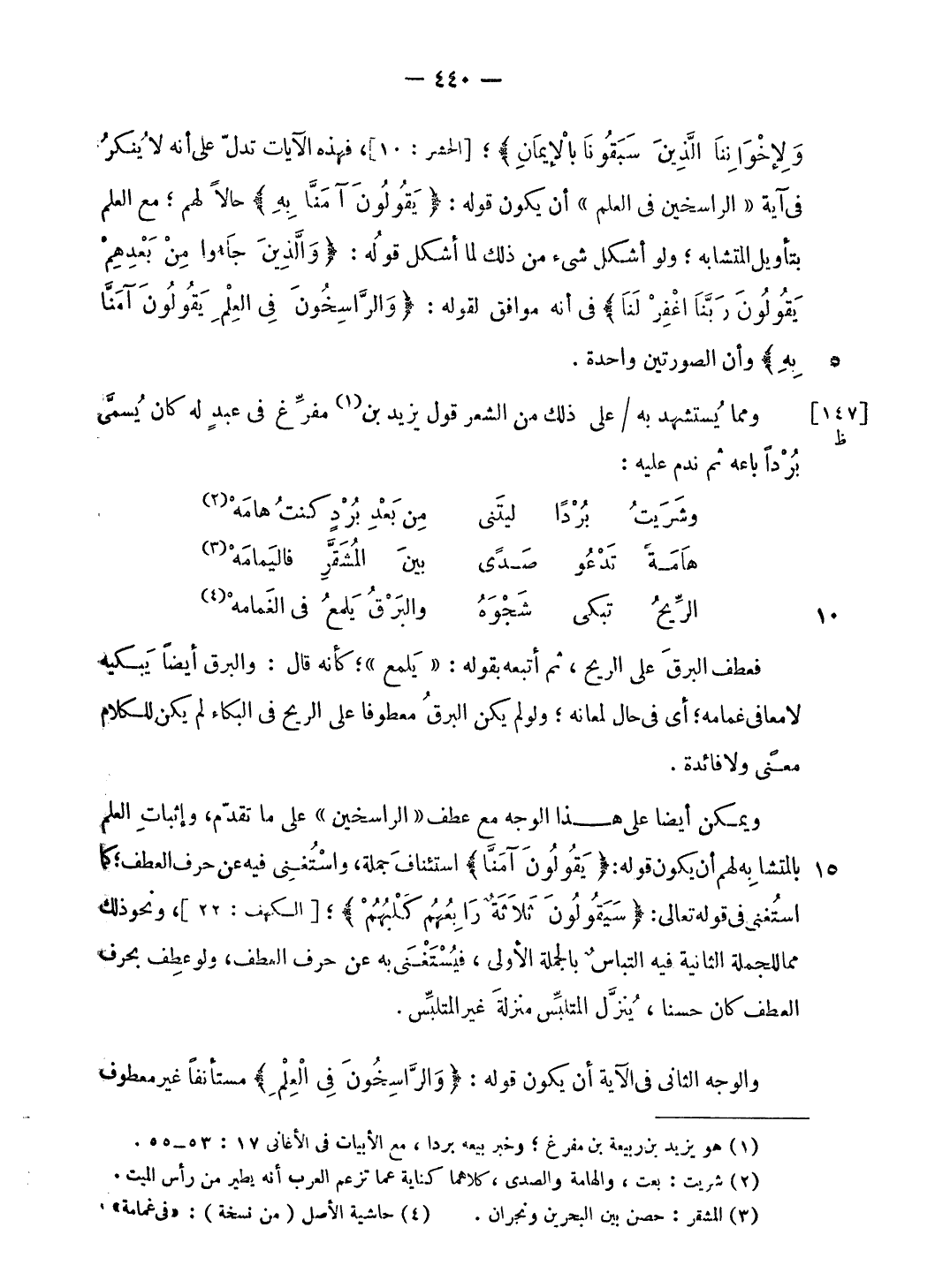 وَلِإِخْوانِنَا الَّذِينَ سَبَقُونا بِالْإِيمانِ؛ [الحشر: 10]، فهذه الآيات تدلّ على أنه لا ينكر فى آية «الراسخين فى العلم» أن يكون قوله: يَقُولُونَ آمَنَّا بِهِ حالا لهم؛ مع العلم بتأويل المتشابه؛ ولو أشكل شيء من ذلك لما أشكل قوله: وَالَّذِينَ جاؤُ مِنْ بَعْدِهِمْ يَقُولُونَ رَبَّنَا اغْفِرْ لَنا فى أنه موافق لقوله: وَالرَّاسِخُونَ فِي الْعِلْمِ يَقُولُونَ آمَنَّا بِهِ وأن الصورتين واحدة.