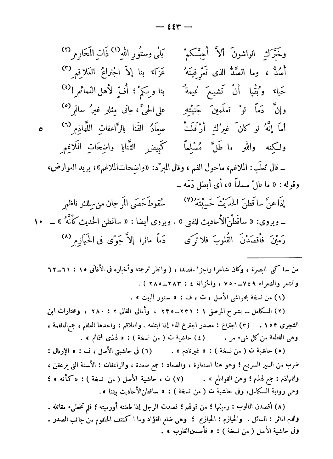 (¬7) ت، حاشية الأصل (من نسخة): «كأنه»؛ وهى رواية الكامل، وفى حاشية ت (من نسخة): «ساقطن الأحاديث بيننا».