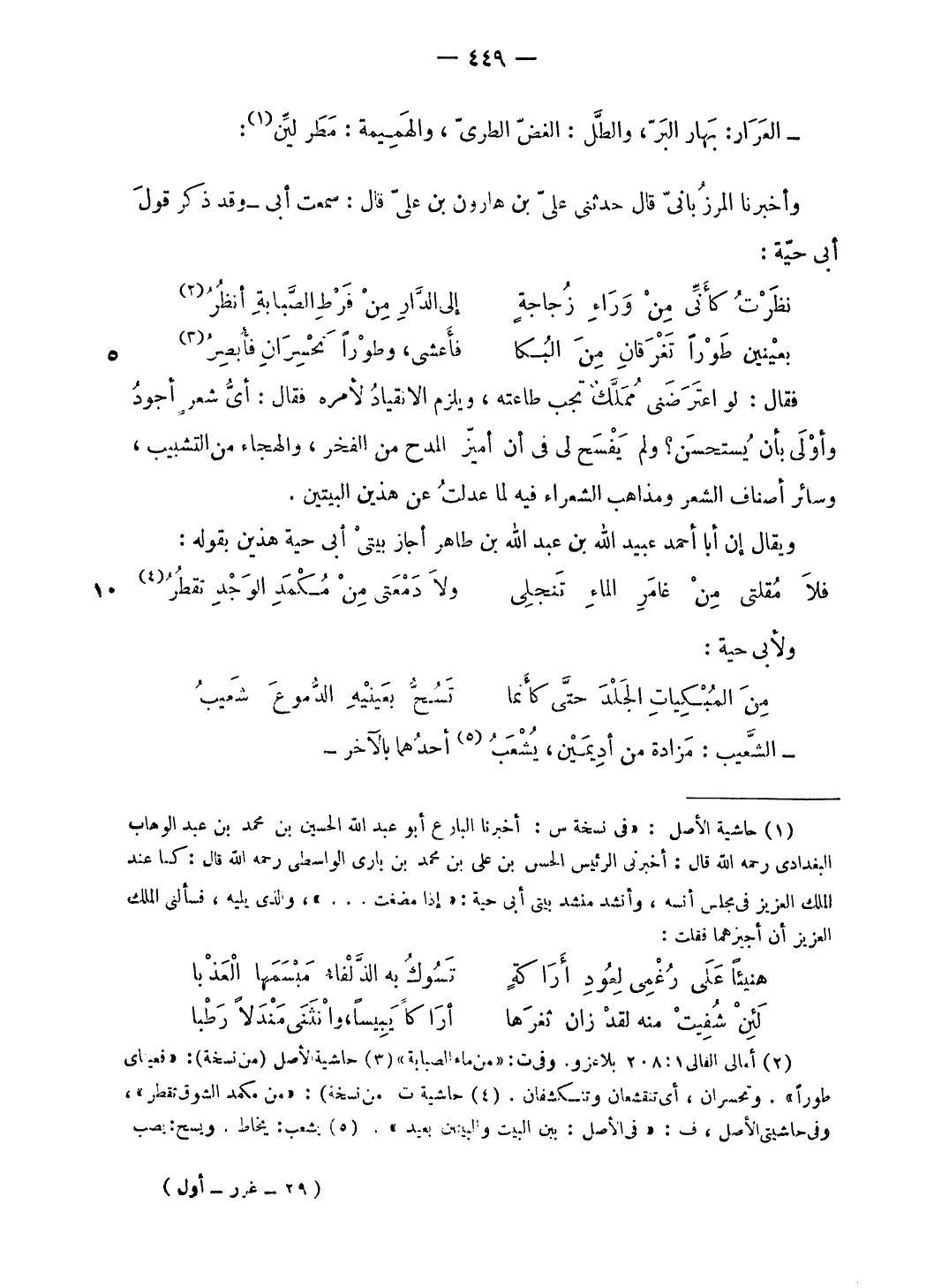 (¬1) حاشية الأصل: «فى نسخة س: أخبرنا البارع أبو عبد الله الحسين بن محمد بن عبد الوهاب البغدادى رحمه الله قال: أخبرنى الرئيس الحسن بن على بن محمد بن بارى الواسطى رحمه الله قال: كنا عند الملك العزيز فى مجلس أنسه، وأنشد منشد بيتى أبى حية: «إذا مضغت ... »، والّذي يليه، فسألنى الملك العزيز أن أجيزهما فقلت: