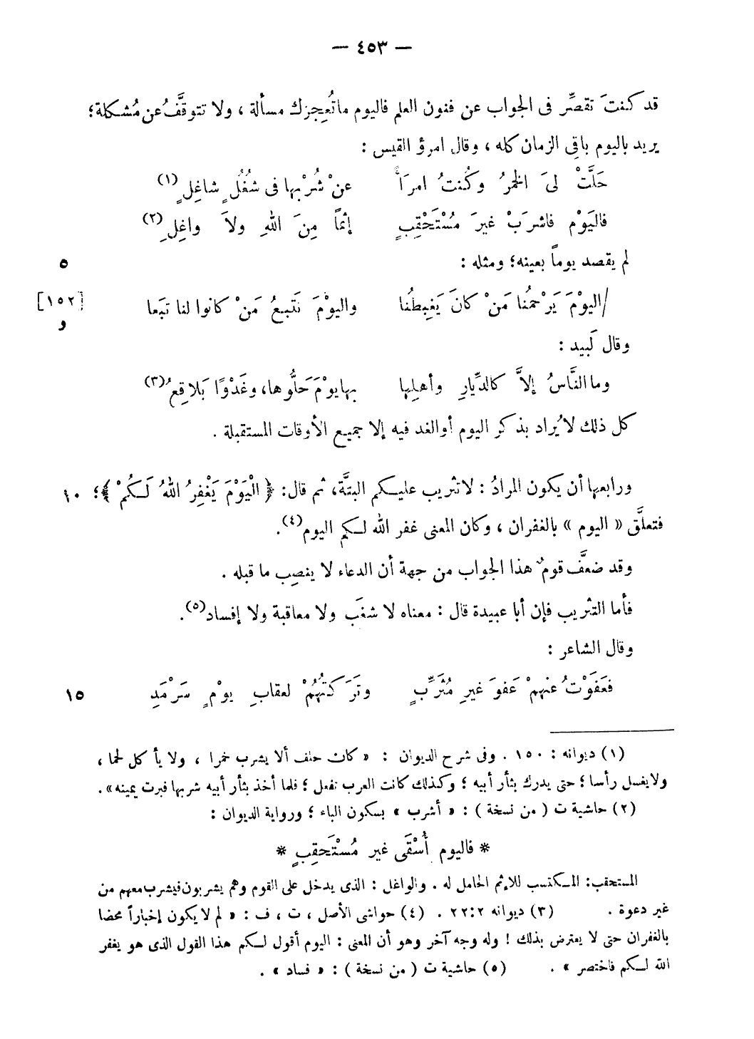 قد كنت تقصّر فى الجواب عن فنون العلم فاليوم ما تعجزك مسألة، ولا تتوقّف عن مشكلة؛ يريد باليوم باقى الزمان كله، وقال امرؤ القيس: