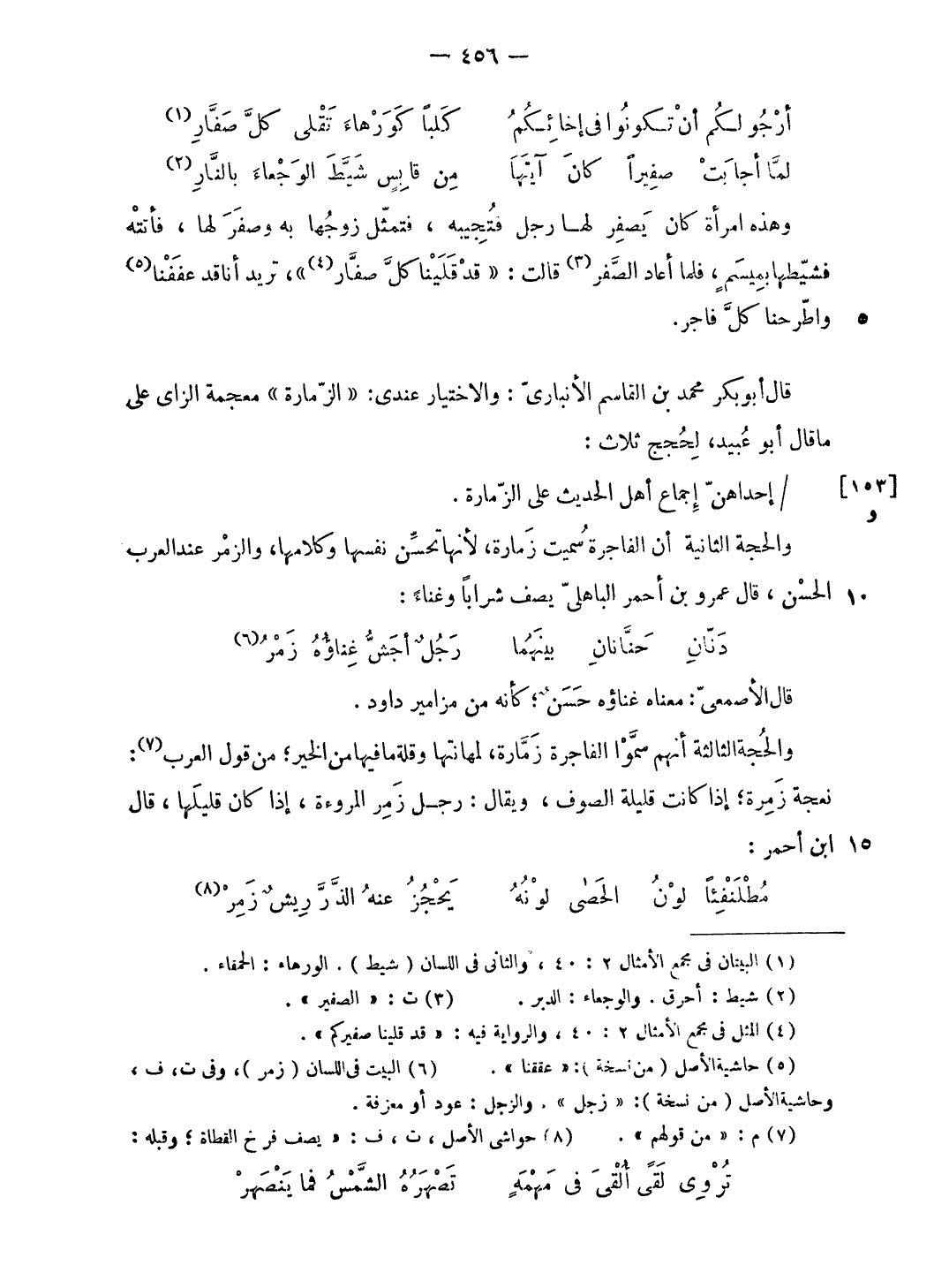 والحجة الثانية أن الفاجرة سميت زمارة، لأنها تحسّن نفسها وكلامها، والزمر عند العرب الحسن، قال عمرو بن أحمر الباهلىّ يصف شرابا وغناء:
