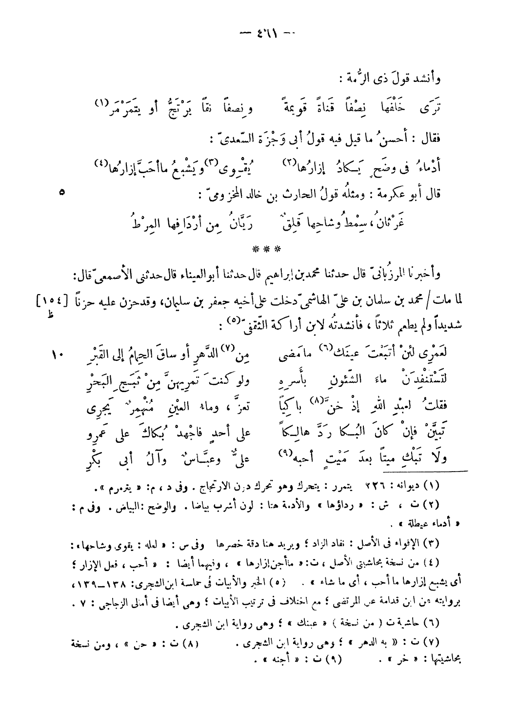 وأخبرنا المرزبانىّ قال حدثنا محمد بن إبراهيم قال حدثنا أبو العيناء قال حدثنى الأصمعىّ قال: