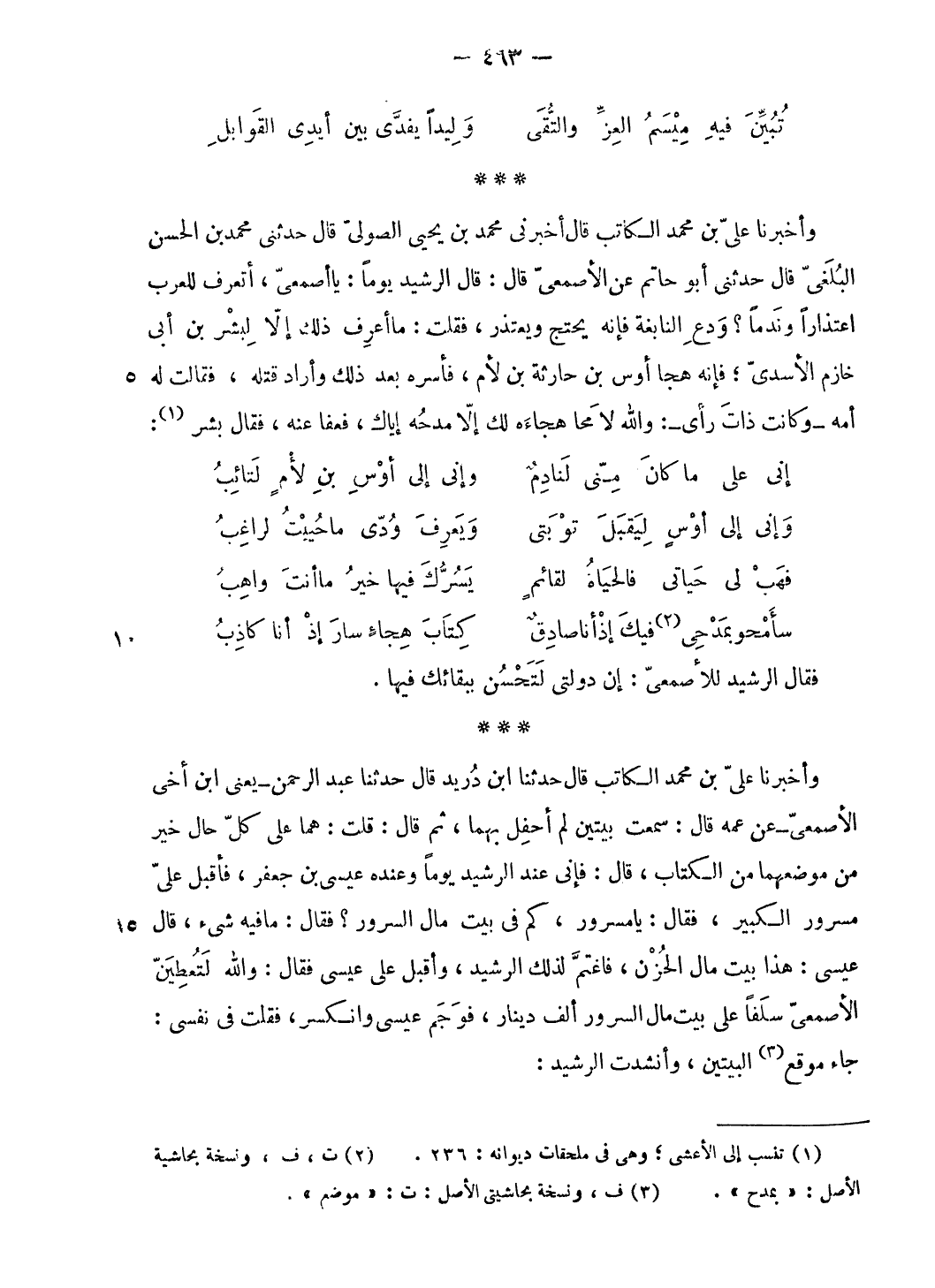 *** وأخبرنا عليّ بن محمد الكاتب قال حدثنا ابن دريد قال حدثنا عبد الرحمن- يعنى ابن أخى الأصمعىّ- عن عمه قال: سمعت بيتين لم أحفل بهما، ثم قال: قلت: هما على كلّ حال خير من موضعهما من الكتاب، قال: فإنى عند الرشيد يوما وعنده عيسى بن جعفر، فأقبل عليّ مسرور الكبير، فقال: يا مسرور، كم فى بيت مال السرور؟ فقال: ما فيه شيء، قال عيسى: هذا بيت مال الحزن، فاغتمّ لذلك الرشيد، وأقبل على عيسى فقال: والله لتعطينّ الأصمعىّ سلفا على بيت مال السرور ألف دينار، فوجم عيسى وانكسر، فقلت فى نفسى: