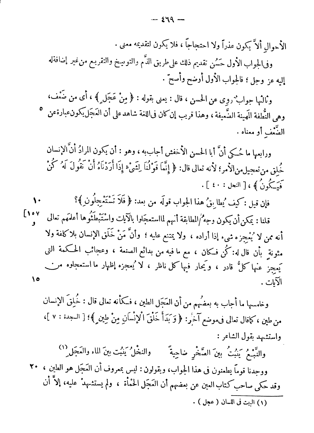 وخامسها ما أجاب به بعضهم من أن العجل الطين، فكأنه تعالى قال: خلق الإنسان من طين، كما قال تعالى فى موضع آخر: وَبَدَأَ خَلْقَ الْإِنْسانِ مِنْ طِينٍ؛ [السجدة: 7]، واستشهد بقول الشاعر: