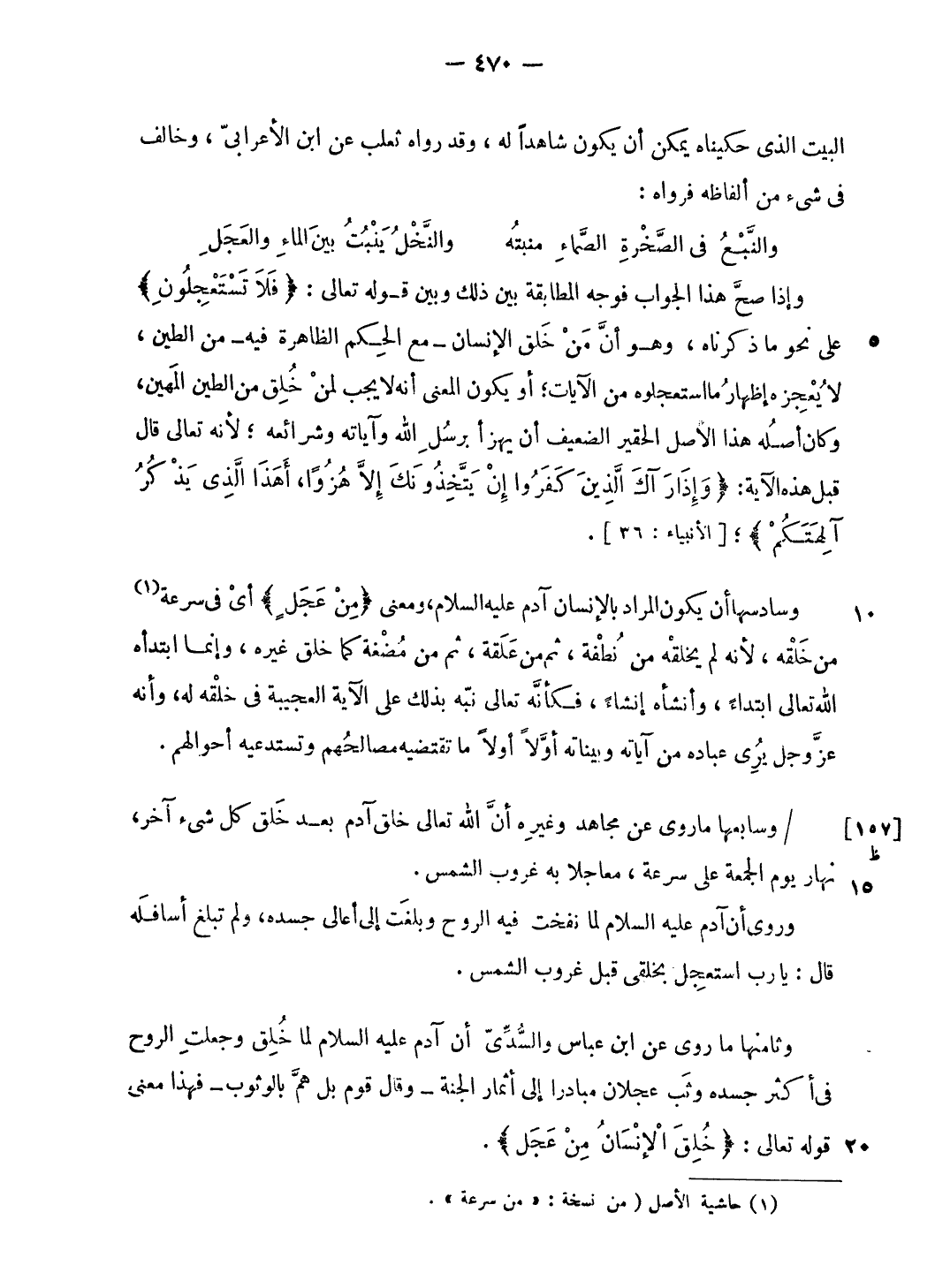 وثامنها ما روى عن ابن عباس والسّدّيّ أن آدم عليه السلام لما خلق وجعلت الروح فى أكثر جسده وثب عجلان مبادرا إلى أثمار الجنة- وقال قوم بل همّ بالوثوب- فهذا معنى قوله تعالى: خُلِقَ الْإِنْسانُ مِنْ عَجَلٍ.