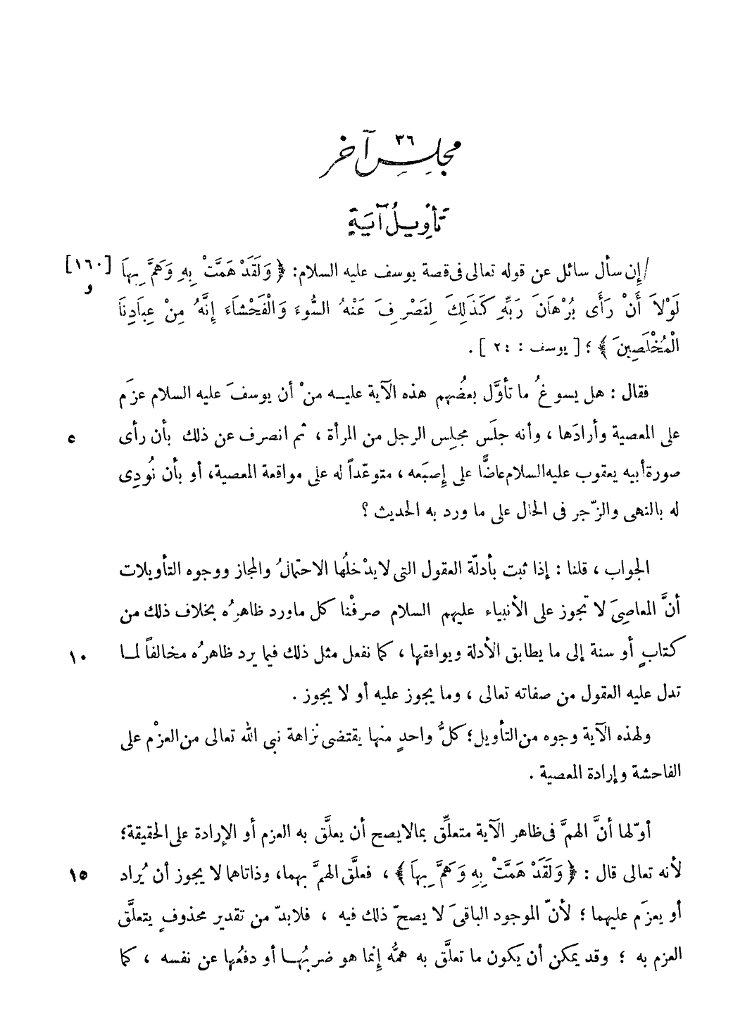 فقال: هل يسوغ ما تأوّل بعضهم هذه الآية عليه من أن يوسف عليه السلام عزم على المعصية وأرادها، وأنه جلس مجلس الرجل من المرأة، ثم انصرف عن ذلك بأن رأى صورة أبيه يعقوب عليه السلام عاضّا على إصبعه، متوعّدا له على مواقعة المعصية، أو بأن نودى له بالنهى والزّجر فى الحال على ما ورد به الحديث؟