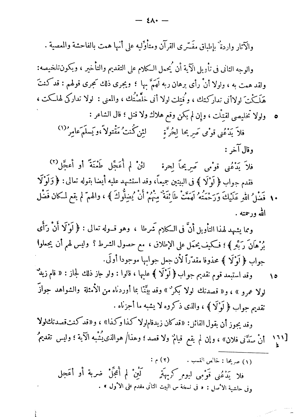 فقدم جواب فَلَوْلا فى البيتين جميعا، وقد استشهد عليه أيضا بقوله تعالى: وَلَوْلا فَضْلُ اللَّهِ عَلَيْكَ وَرَحْمَتُهُ لَهَمَّتْ طائِفَةٌ مِنْهُمْ أَنْ يُضِلُّوكَ، والهمّ لم يقع لمكان فضل الله ورحمته.