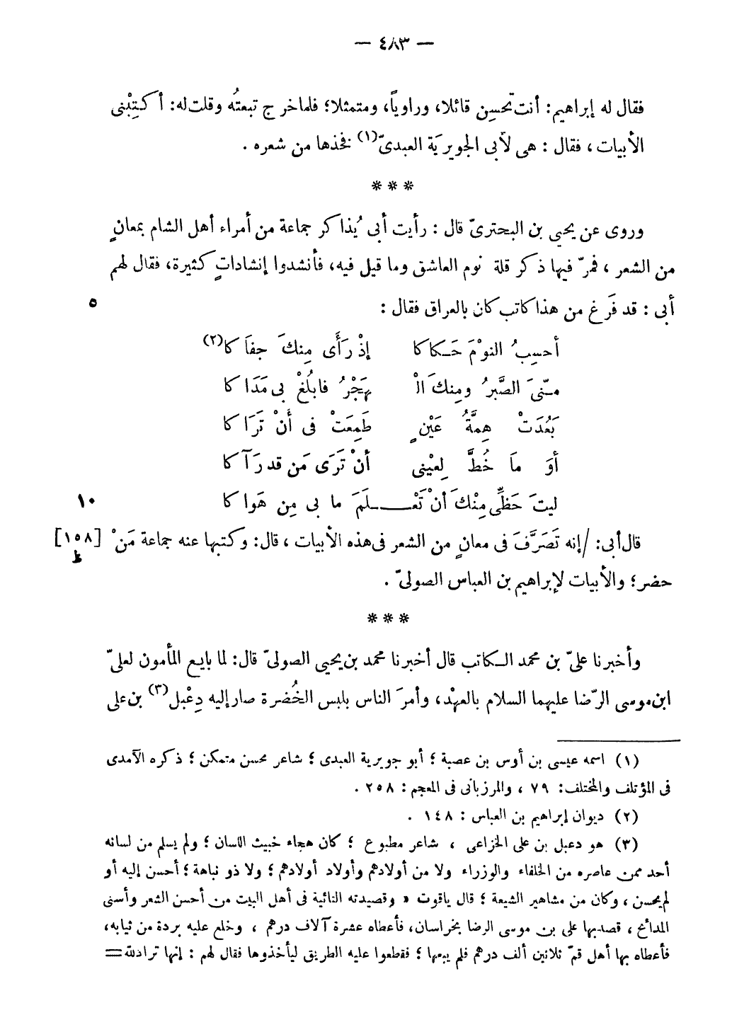 *** وروى عن يحيى بن البحترىّ قال: رأيت أبى يذاكر جماعة من أمراء أهل الشام بمعان من الشعر، فمرّ فيها ذكر قلة نوم العاشق وما قيل فيه، فأنشدوا إنشادات كثيرة، فقال لهم أبى: قد فرغ من هذا كاتب كان بالعراق فقال: