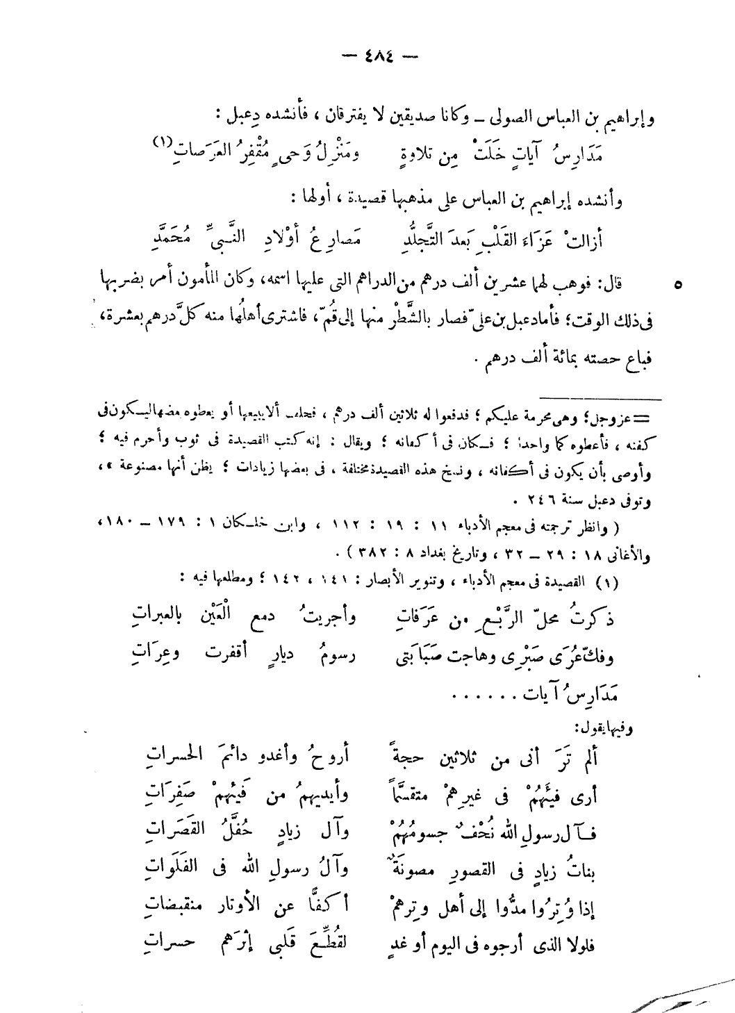 (وانظر ترجمته فى معجم الأدباء 11: 19: 112، وابن خلكان 1: 179 - 180، والأغانى 18: 29 - 32، وتاريخ بغداد 8: 382).