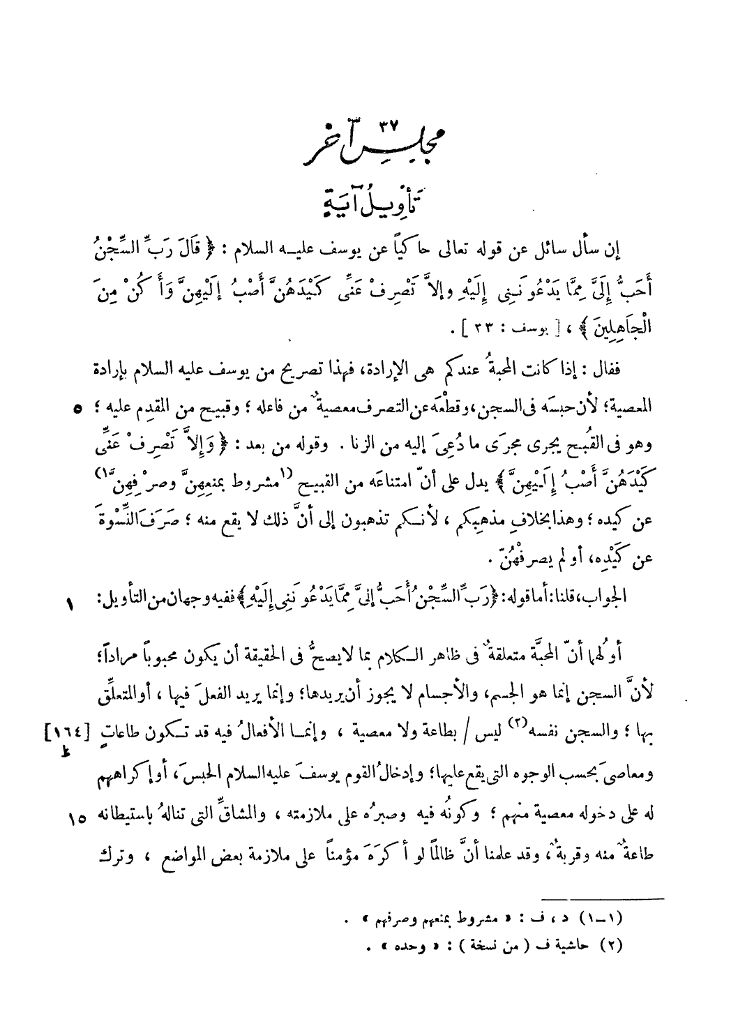 فقال: إذا كانت المحبة عندكم هى الإرادة، فهذا تصريح من يوسف عليه السلام بإرادة المعصية؛ لأن حبسه فى السجن، وقطعه عن التصرف معصية من فاعله؛ وقبيح من المقدم عليه؛ وهو فى القبح يجرى مجرى ما دعى إليه من الزنا. وقوله من بعد: وَإِلَّا تَصْرِفْ عَنِّي كَيْدَهُنَّ أَصْبُ إِلَيْهِنَّ يدل على أنّ امتناعه من القبيح [مشروط بمنعهنّ وصرفهنّ] (¬1) عن كيده؛ وهذا بخلاف مذهبكم، لأنكم تذهبون إلى أنّ ذلك لا يقع منه؛ صرف النّسوة عن كيده، أو لم يصرفهنّ.