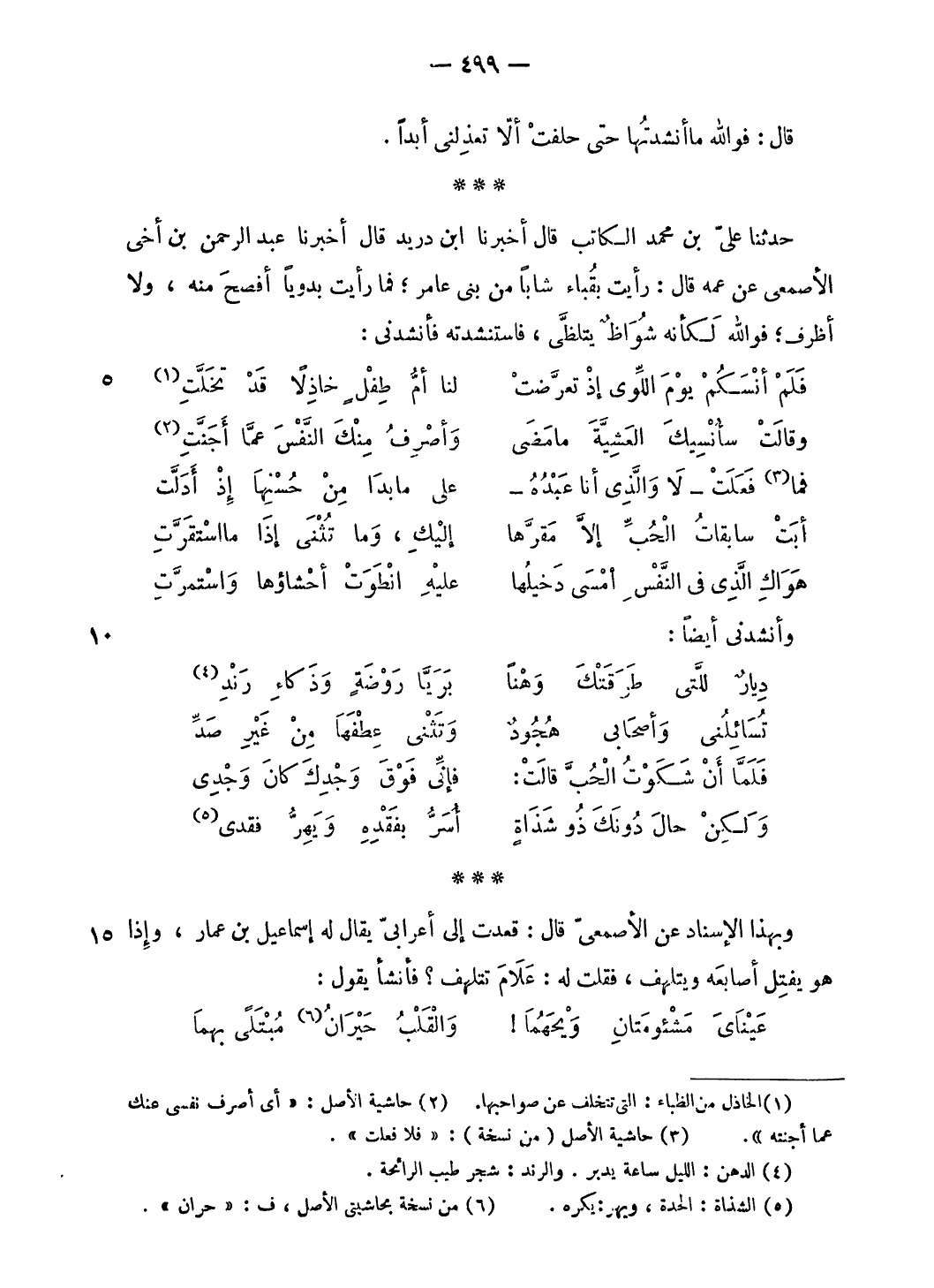 حدثنا عليّ بن محمد الكاتب قال أخبرنا ابن دريد قال أخبرنا عبد الرحمن بن أخى الأصمعى عن عمه قال: رأيت بقباء شابا من بنى عامر؛ فما رأيت بدويا أفصح منه، ولا أظرف؛ فو الله لكأنه شواظ يتلظّى، فاستنشدته فأنشدنى: