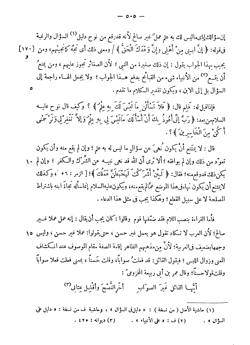 قال: لا يمتنع أن يكون نهى عن سؤال ما ليس له به علم؛ وإن لم يقع منه وأن يكون تعوّد من ذلك وإن لم يوافقه؛ ألا ترى أن الله قد نهى نبيه عن الشّرك والكفر؛ وإن لم يكن ذلك قد وقع منه؛ فقال: لَئِنْ أَشْرَكْتَ لَيَحْبَطَنَّ عَمَلُكَ؛ [الزمر: 56]، وكذلك لا يمتنع أن يكون نهاه فى هذا الموضع عمّا لم يقع منه، ويكون عليه السلام إنما سأله نجاة ابنه باشتراط المصلحة لا على سبيل القطع؛ وهكذا يجب فى مثل هذا الدعاء.
