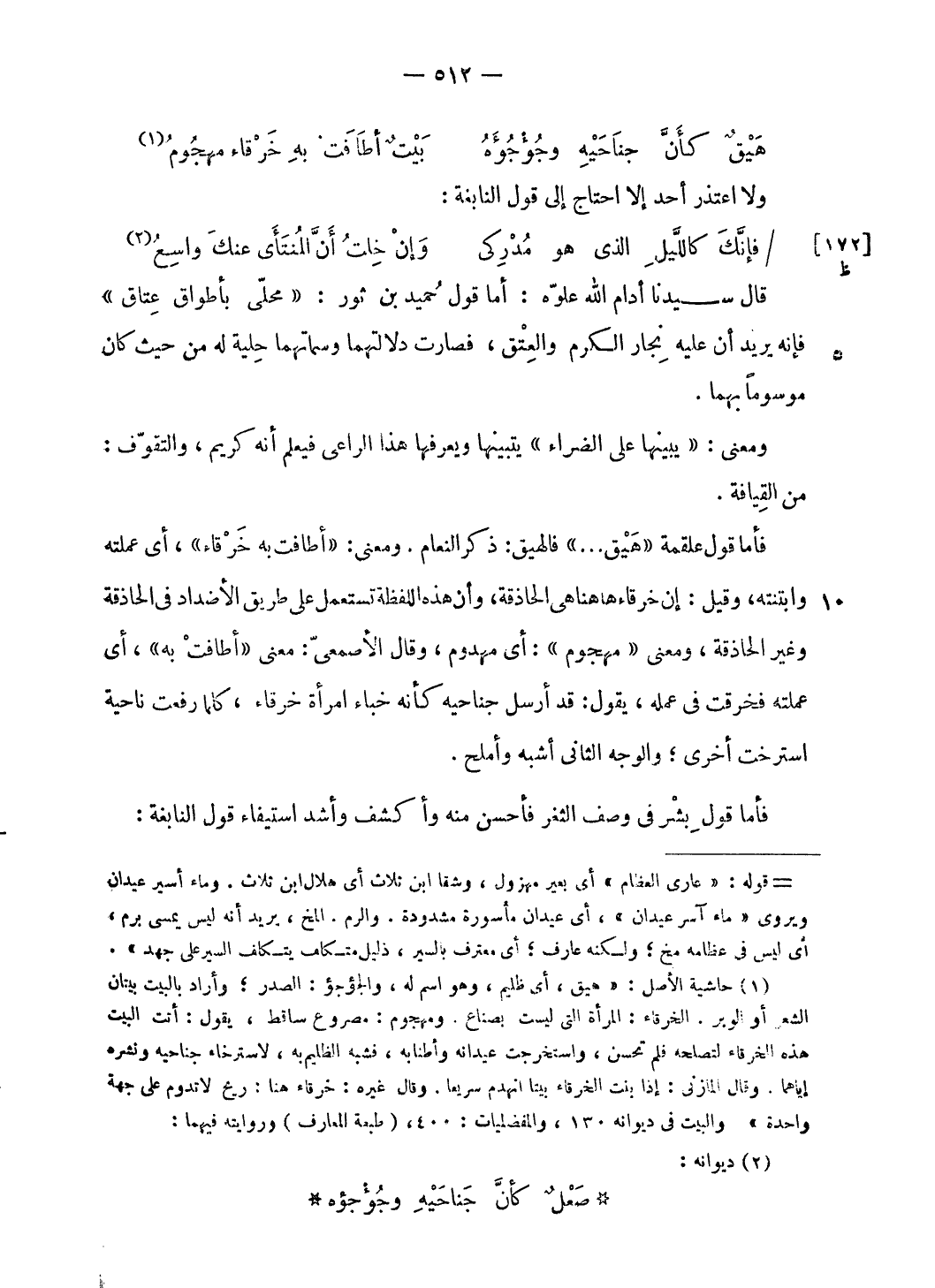 قال سيدنا أدام الله علوّه: أما قول حميد بن ثور: «محلّى بأطواق عتاق» فإنه يريد أن عليه نجار الكرم والعتق، فصارت دلالتهما وسماتهما حلية له من حيث كان موسوما بهما.