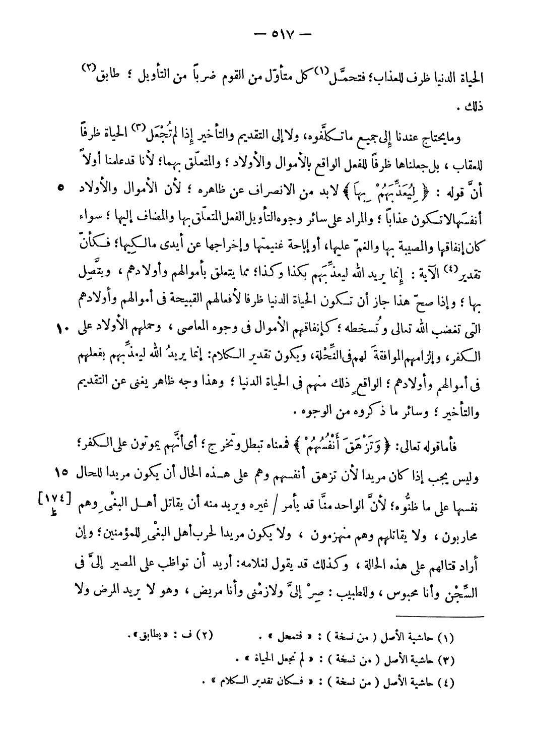 وما يحتاج عندنا إلى جميع ما تكلّفوه، ولا إلى التقديم والتأخير إذا لم تجعل (¬3) الحياة ظرفا للعقاب، بل جعلناها ظرفا للفعل الواقع بالأموال والأولاد؛ والمتعلّق بهما؛ لأنا قد علمنا أولا أنّ قوله: لِيُعَذِّبَهُمْ بِها لا بد من الانصراف عن ظاهره؛ لأن الأموال والأولاد أنفسها لا تكون عذابا؛ والمراد على سائر وجوه التأويل الفعل المتعلّق بها والمضاف إليها؛ سواء كان إنفاقها والمصيبة بها والغمّ عليها، أو إباحة غنيمتها وإخراجها عن أيدى مالكيها؛ فكأنّ تقدير (¬4) الآية: إنما يريد الله ليعذّبهم بكذا وكذا؛ مما يتعلق بأموالهم وأولادهم، ويتّصل بها؛ وإذا صحّ هذا جاز أن تكون الحياة الدنيا ظرفا لأفعالهم القبيحة فى أموالهم وأولادهم التى تغضب الله تعالى وتسخطه؛ كإنفاقهم الأموال فى وجوه المعاصى، وحملهم الأولاد على الكفر، وإلزامهم الموافقة لهم فى النّحلة، ويكون تقدير الكلام: إنما يريد الله ليعذّبهم بفعلهم فى أموالهم وأولادهم؛ الواقع ذلك منهم فى الحياة الدنيا؛ وهذا وجه ظاهر يغنى عن التقديم والتأخير؛ وسائر ما ذكروه من الوجوه.
